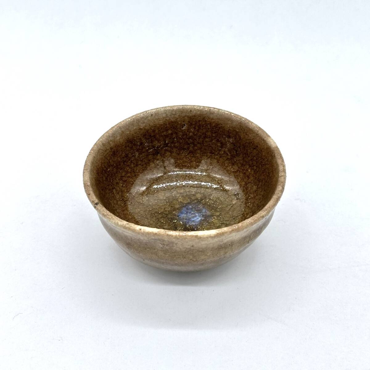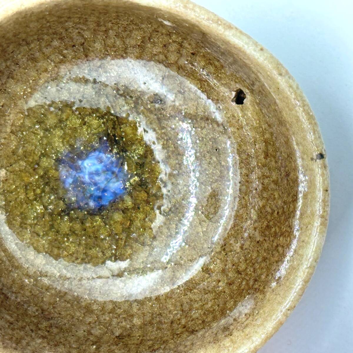 見込みには気泡の加減なのか黄金色に輝く釉薬の溜まりがあり、酒を注ぐと揺らめきます。またその上には雲のような青白い窯変が漂い、表情が豊かです。