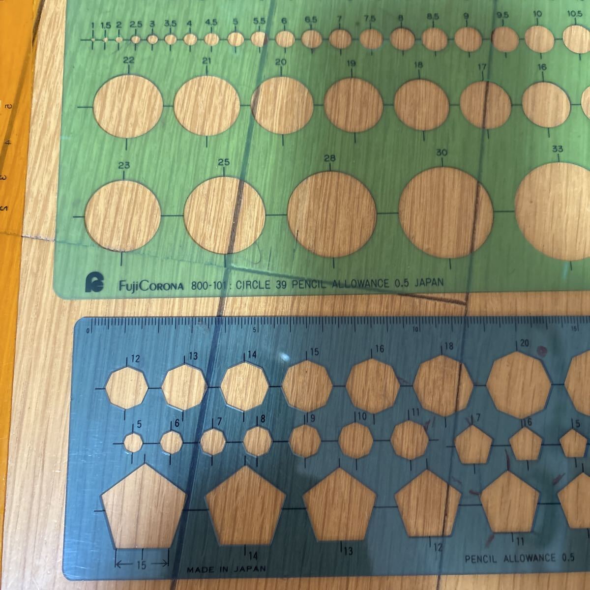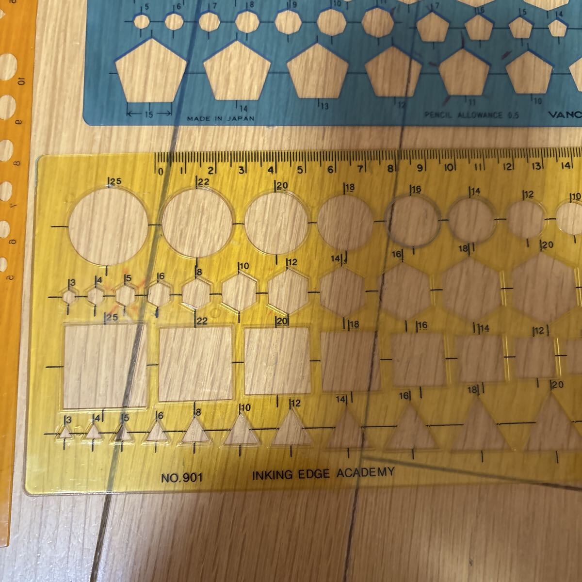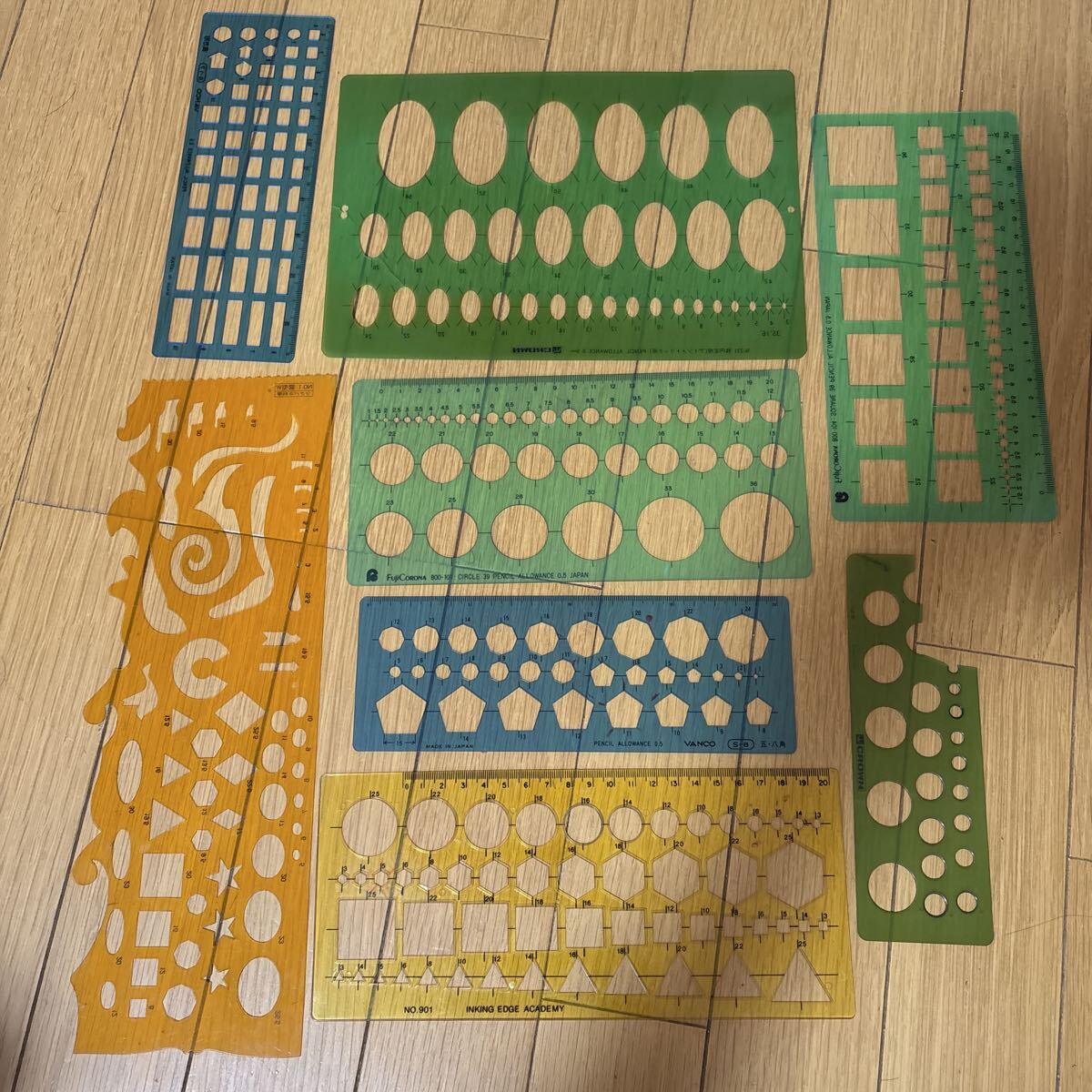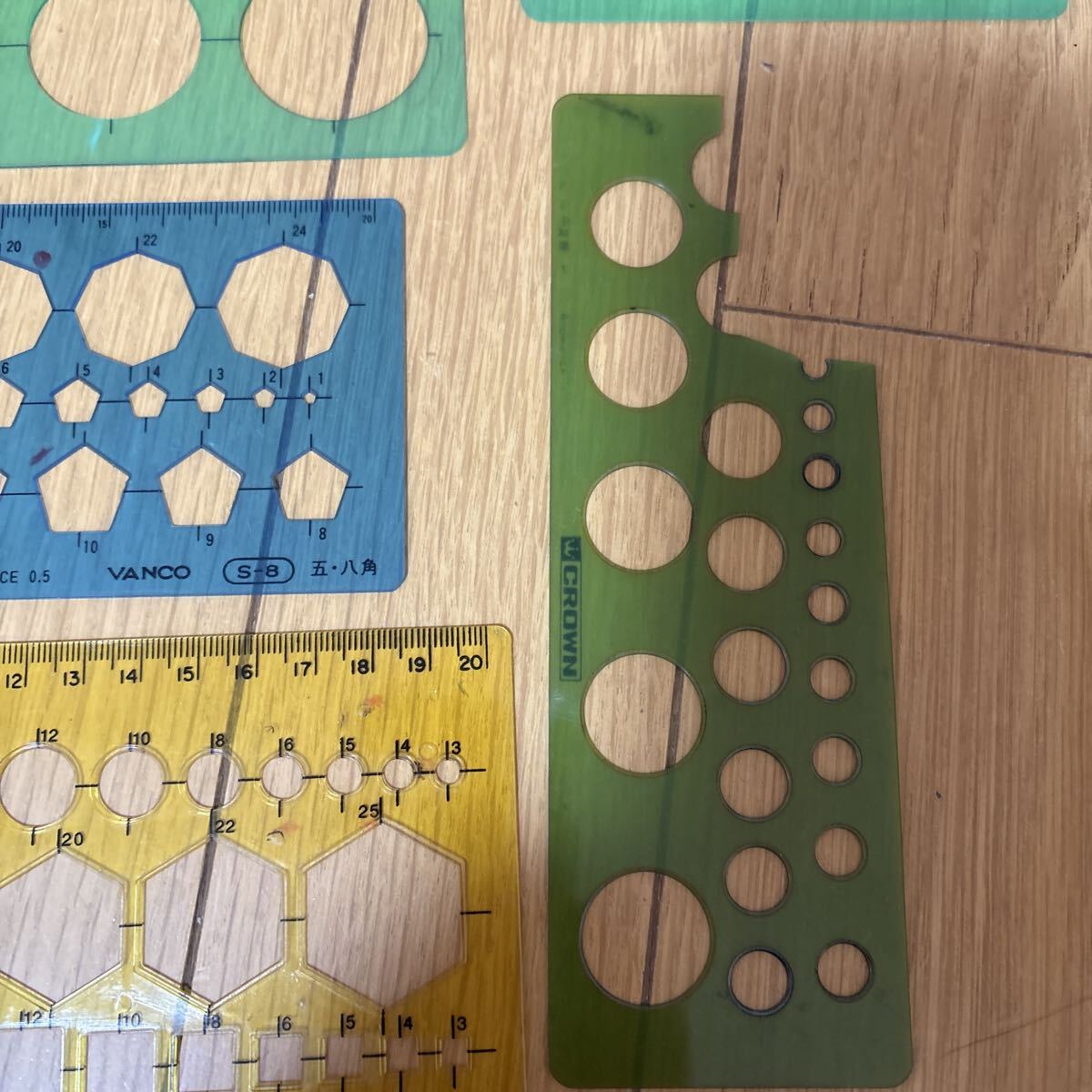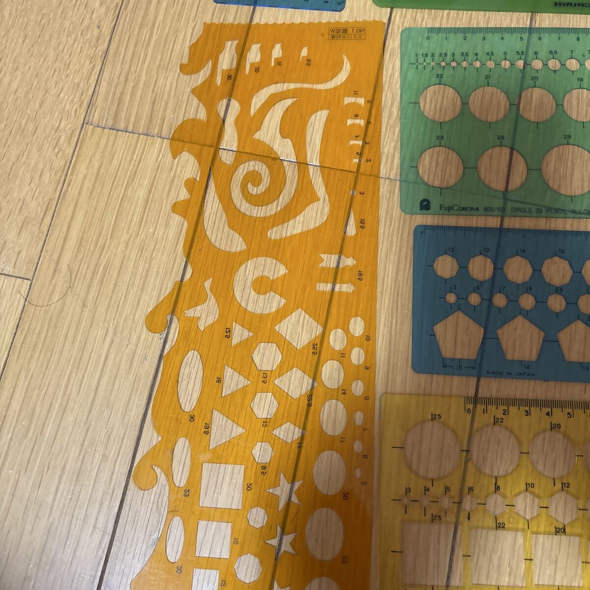 学生時代に製図に使っていました。使用感はありますが、きれいな方だとは思います。手に取った2枚のテンプレートは割れがあります。詳しく調べていませんが、古い物とご理解頂き入札お願い致します。