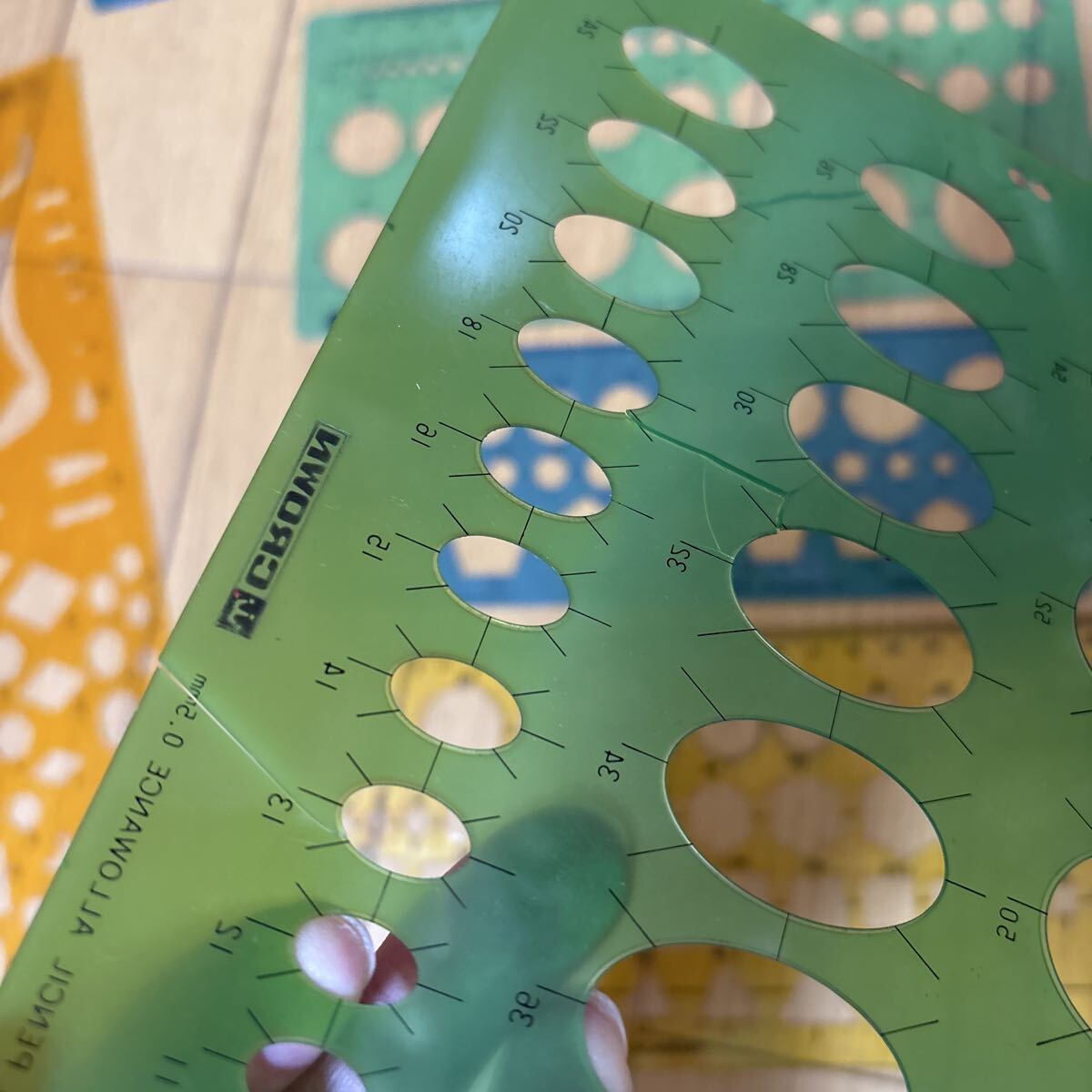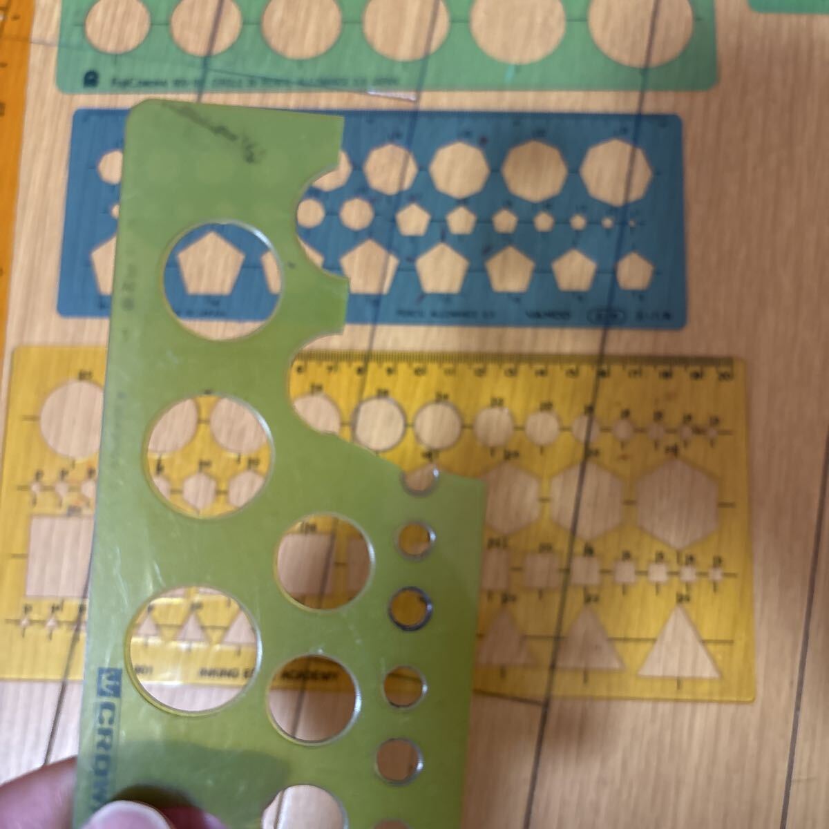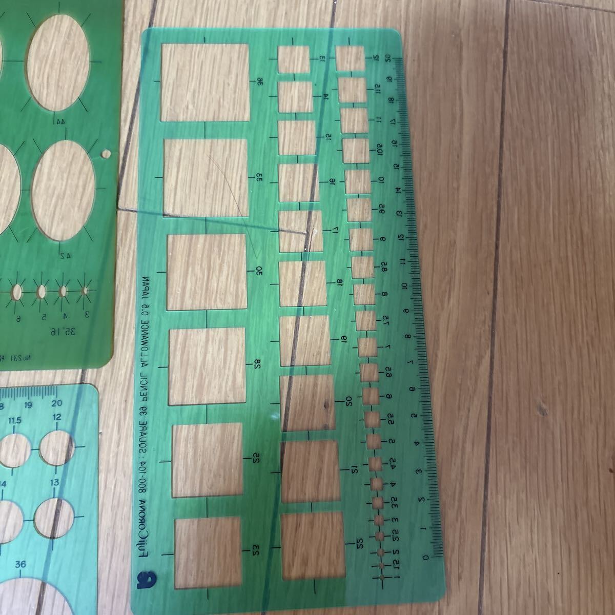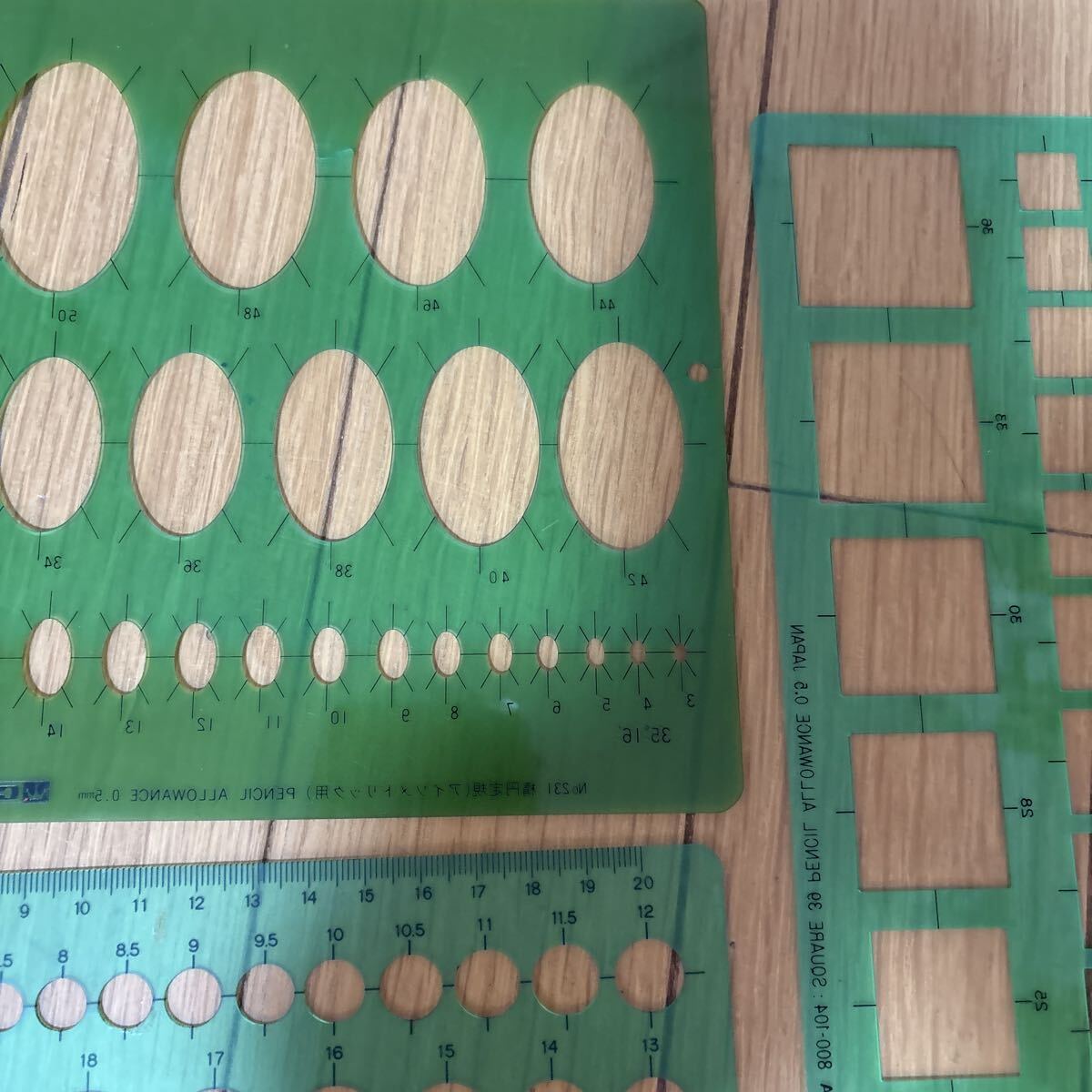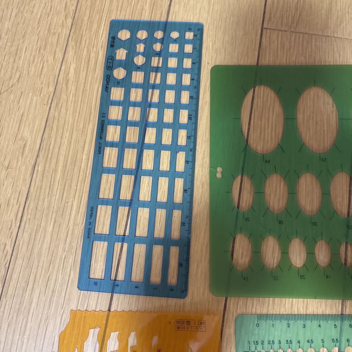 学生時代に製図に使っていました。使用感はありますが、きれいな方だとは思います。手に取った2枚のテンプレートは割れがあります。詳しく調べていませんが、古い物とご理解頂き入札お願い致します。