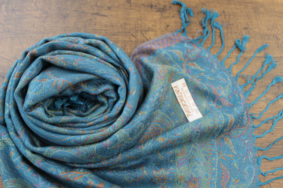 新品【パシュミナ Pashmina】ペイズリー柄 エメラルドグリーン系マルチカラー 緑 E.GREEN 大判 ストール カシミア100% Cashmere