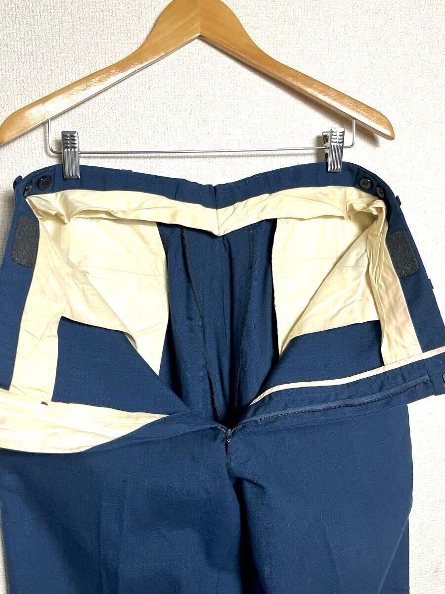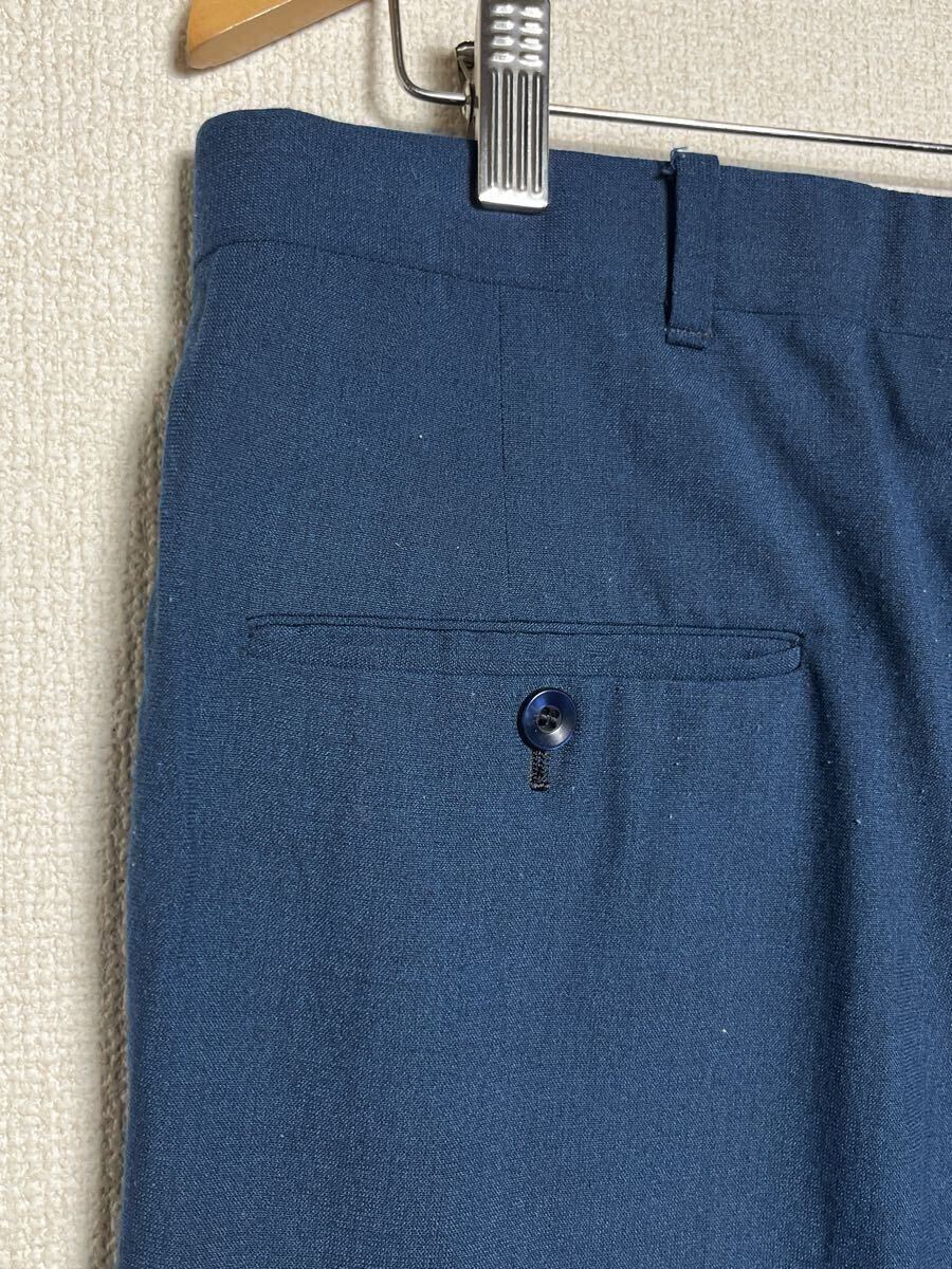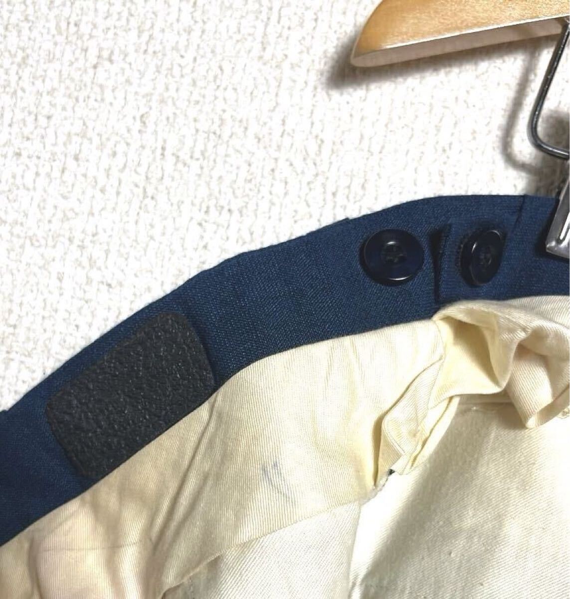 ネイビー×ブラックの杢の様な生地、裾ダブル、裏にサイドアジャスター、滑り止めパッド付き、