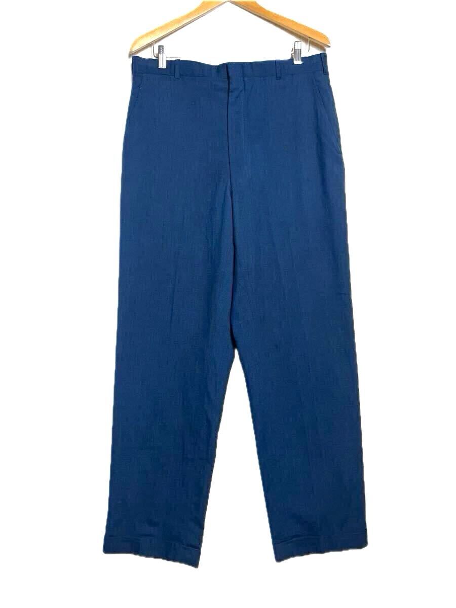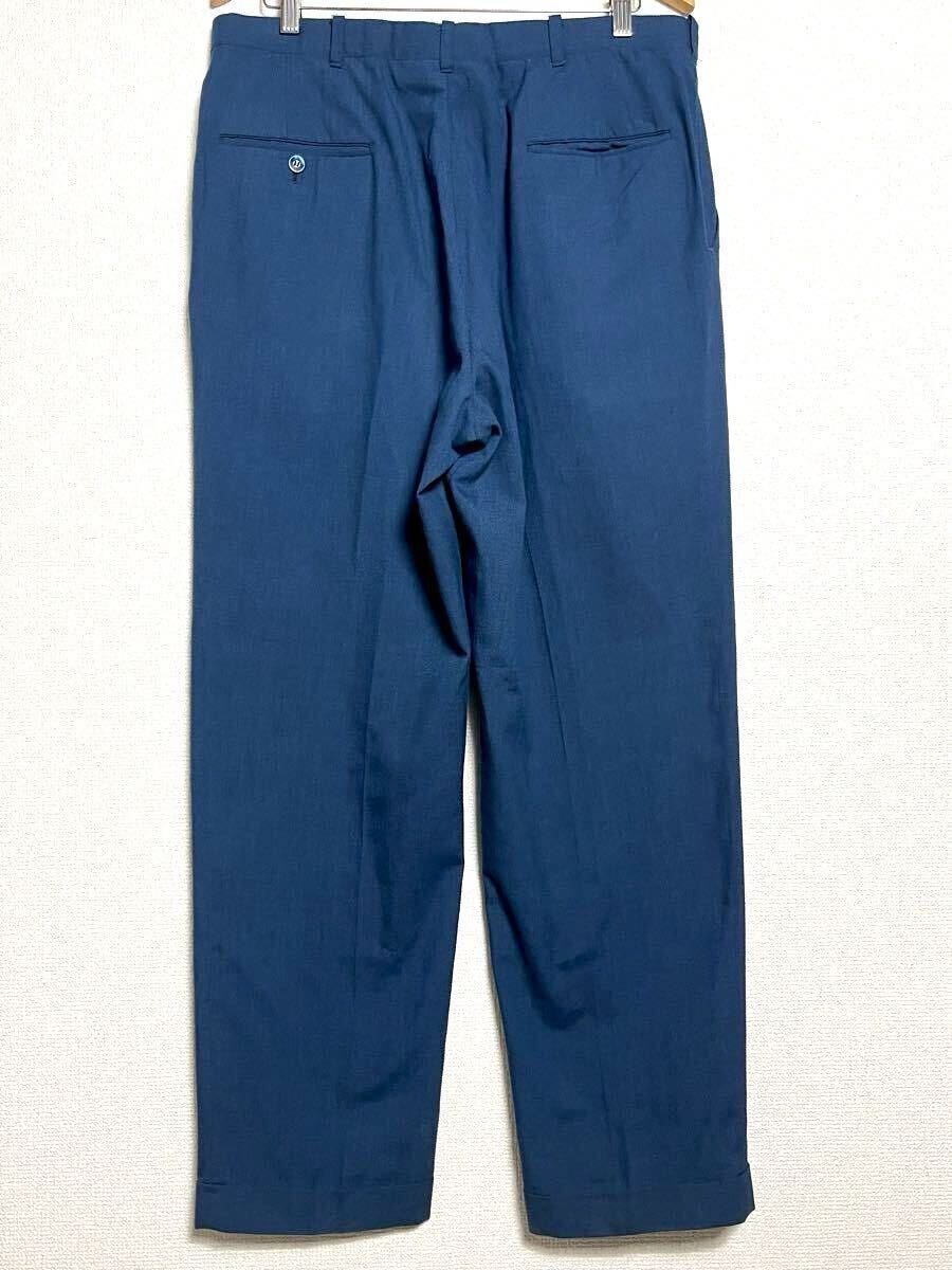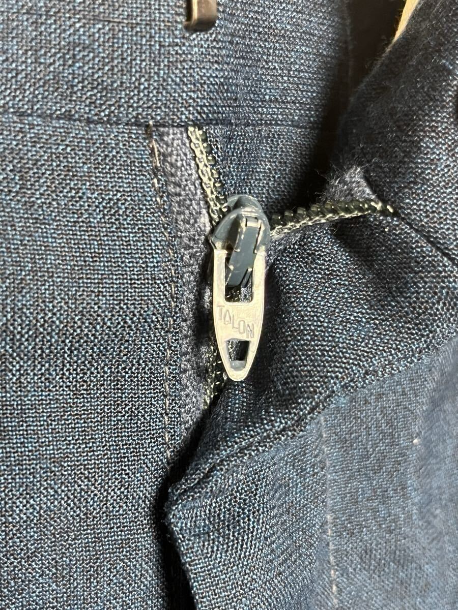 ネイビー×ブラックの杢の様な生地、裾ダブル、裏にサイドアジャスター、滑り止めパッド付き、