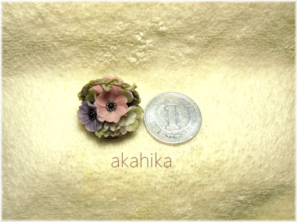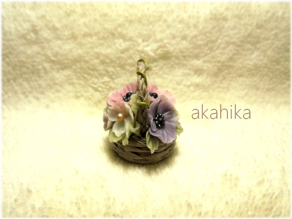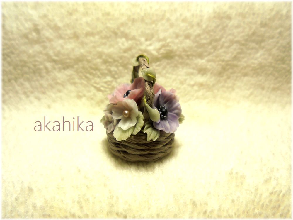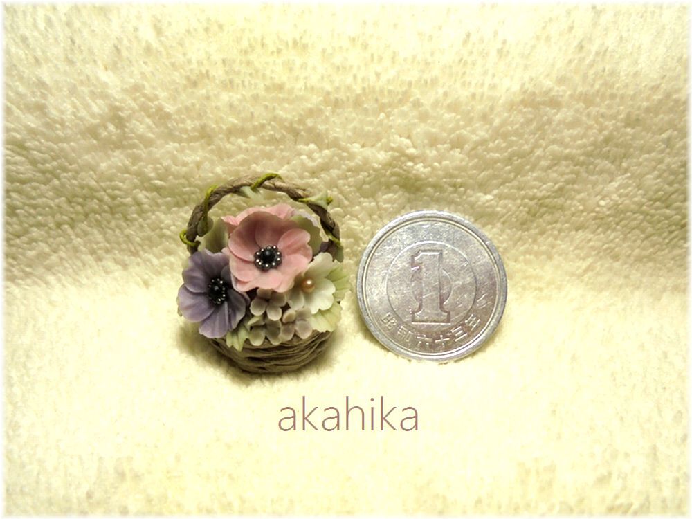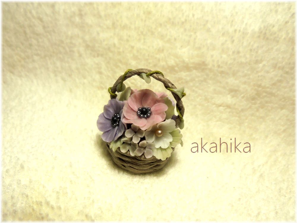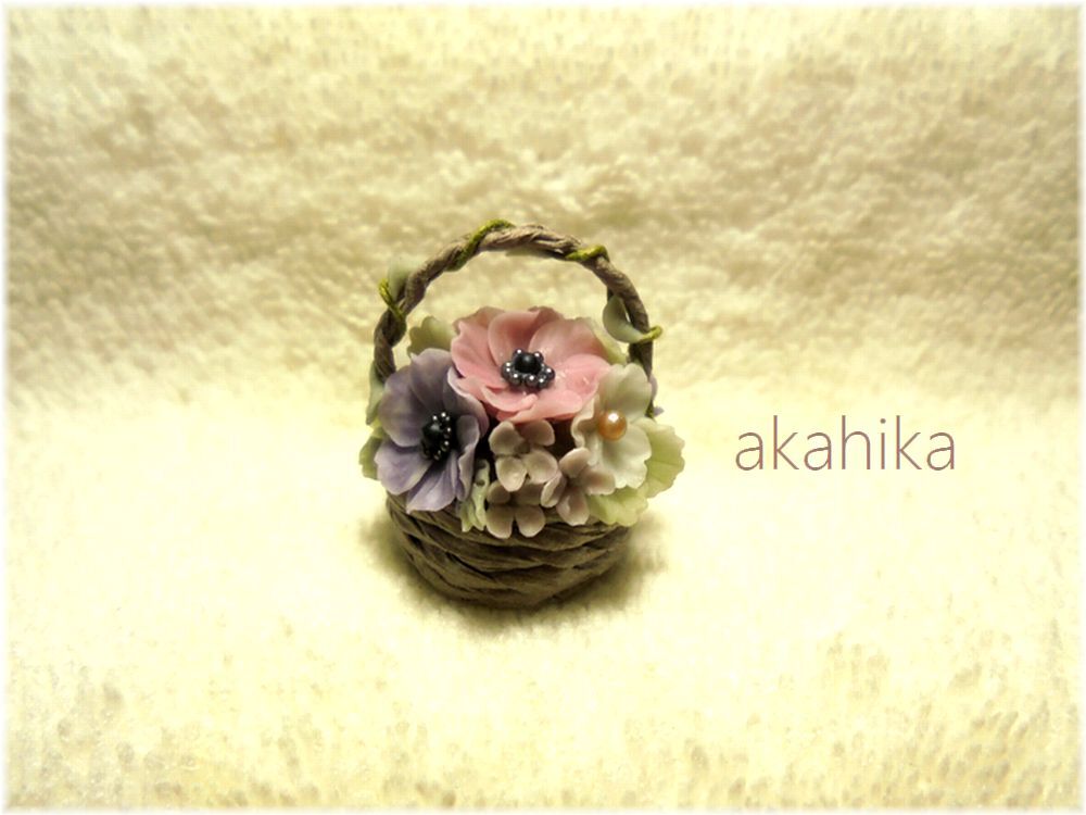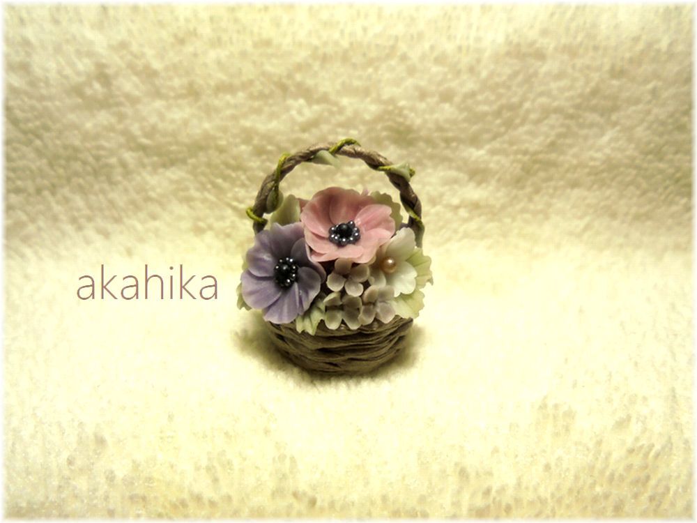 akahika*樹脂粘土*フラワーバスケット(茶)*アネモネと小花・ミニチュア
