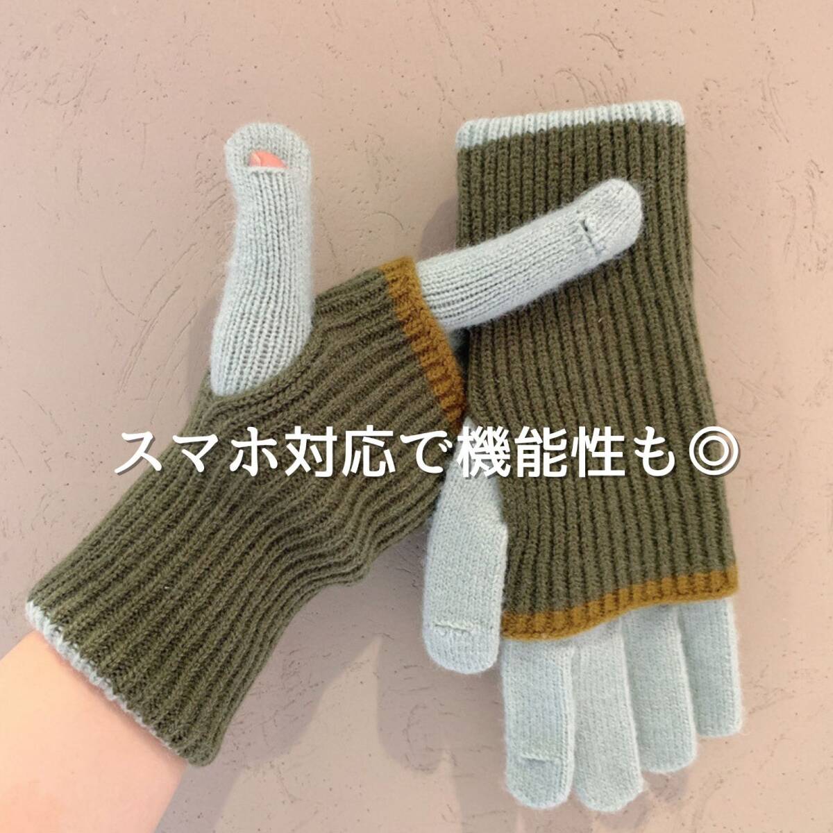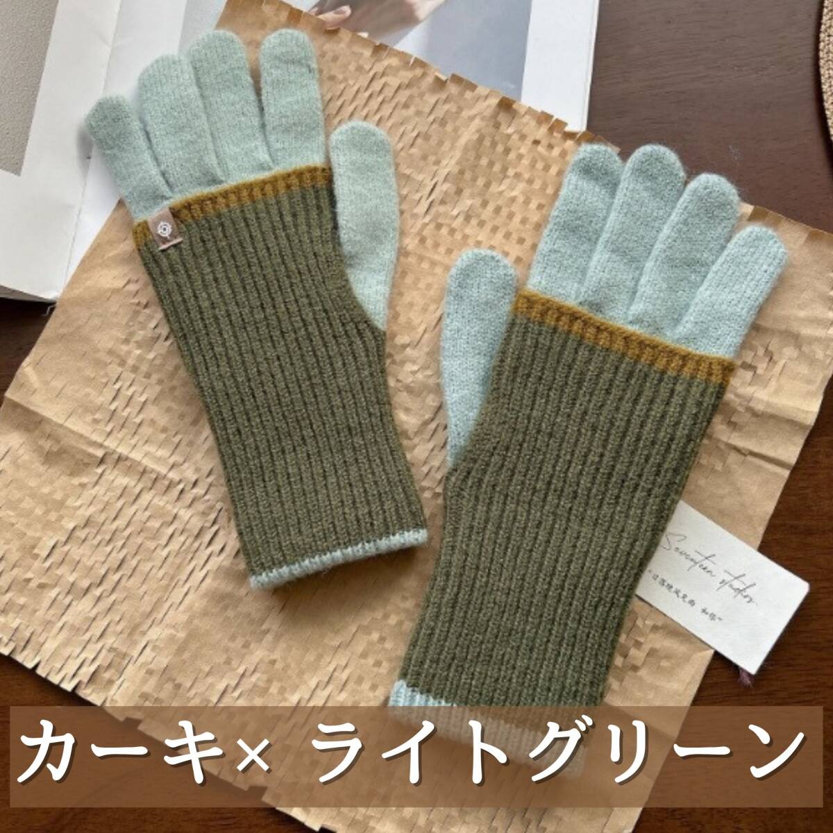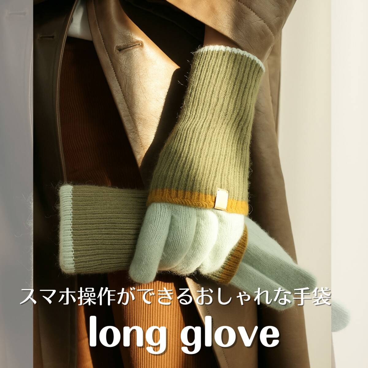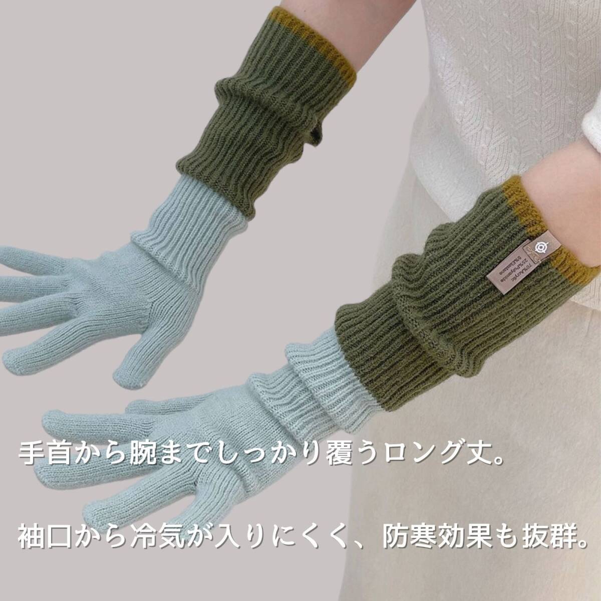 ロング手袋 レディース スマホ対応 2WAY仕様 カーキ×ライトグリーン リブデザイン 防寒 おしゃれ 暖かい 冬用