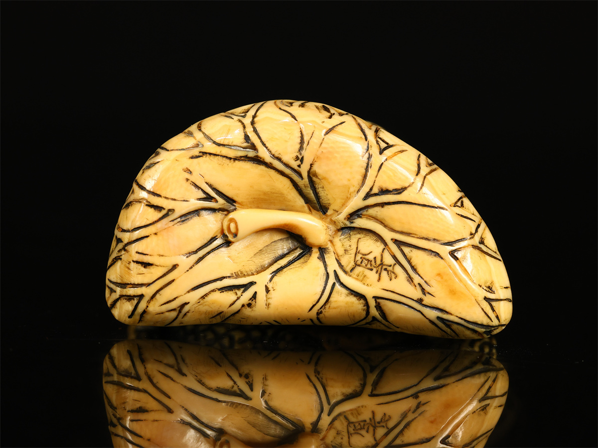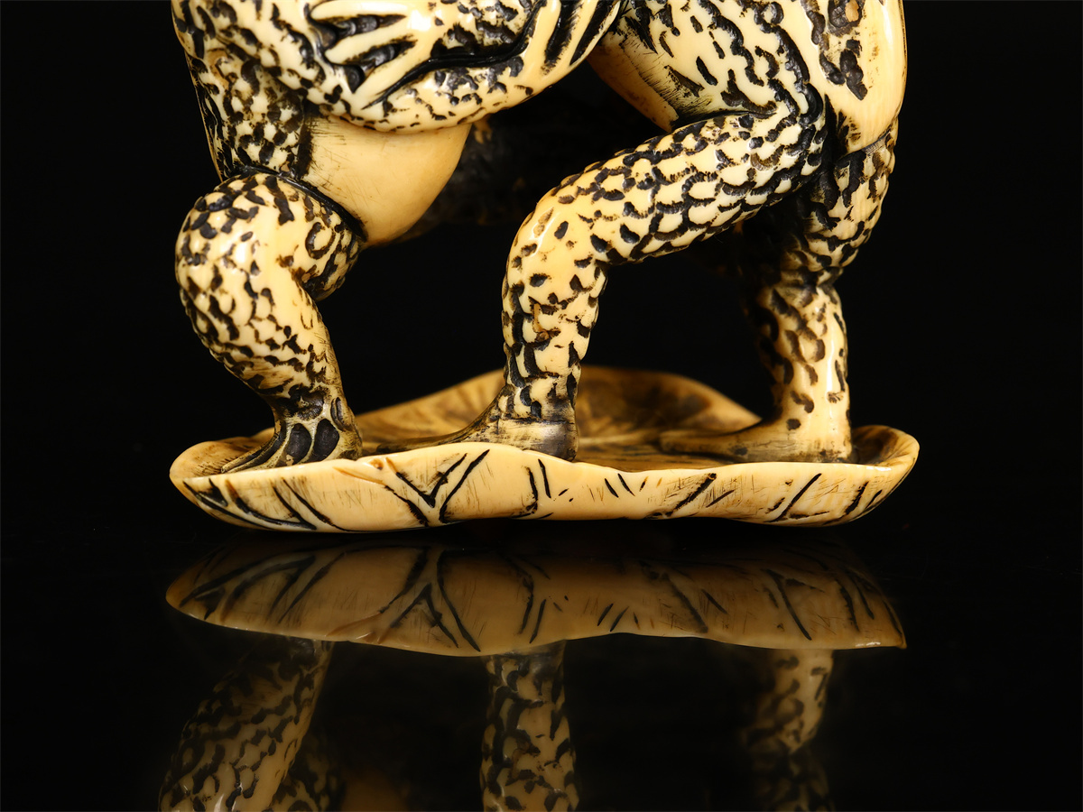 久1315 時代 【正直 作】 東洋彫刻 荷葉に蛙 根付 高5㎝ 箱付 美品H