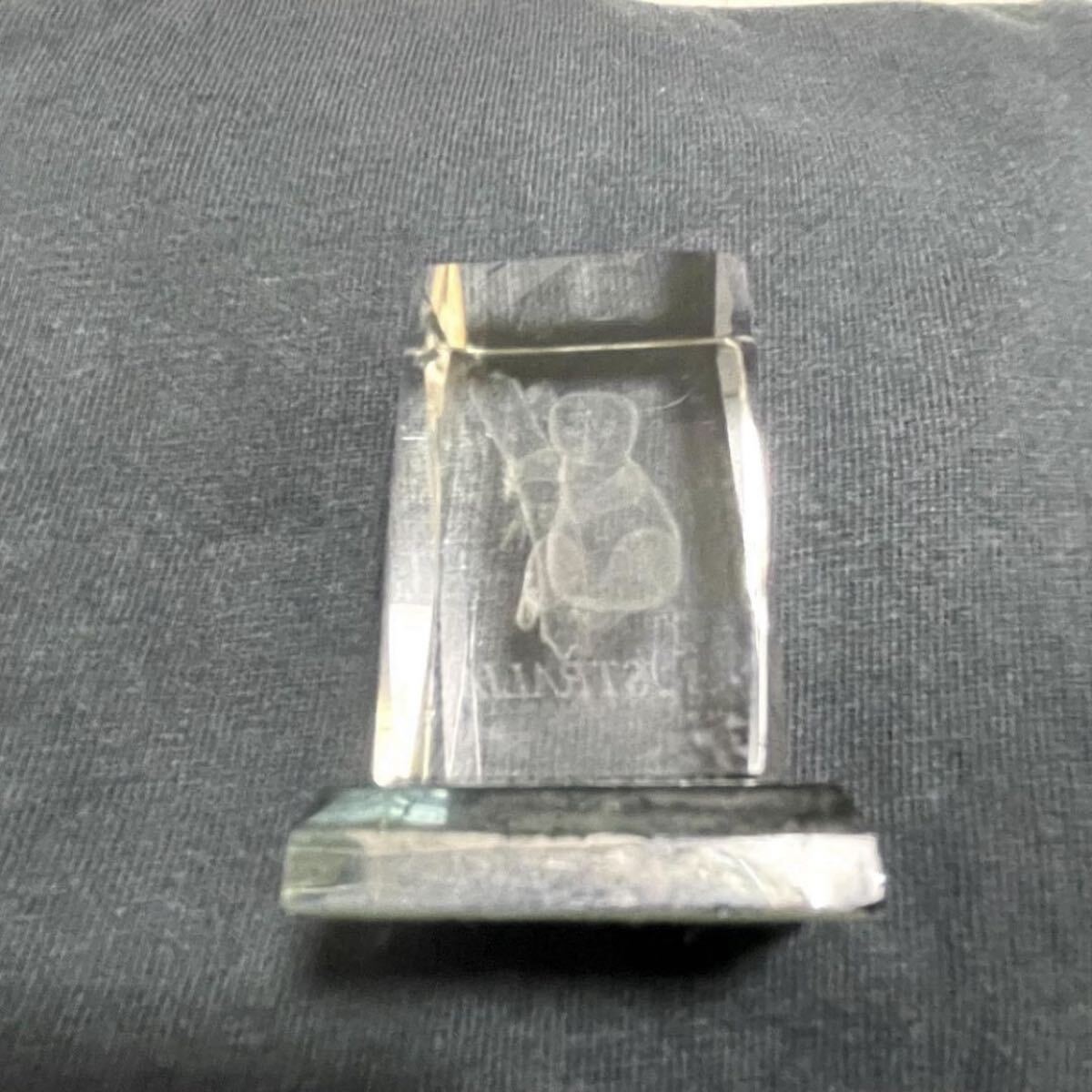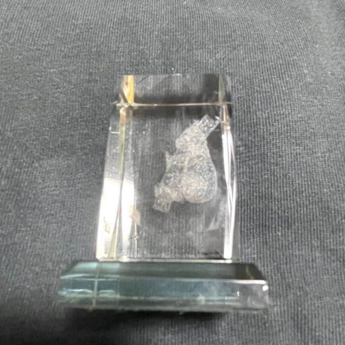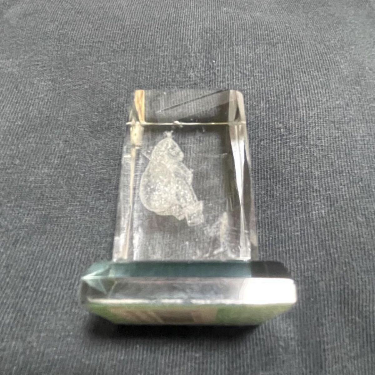 レーザー彫刻で、前後左右、上下の何処から見てもクリスタルガラスの中に像が浮かんで見えます