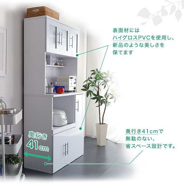| 【ポイント】 ①ワイドな食器棚は食器はもちろん、レンジや家電も一緒に収納が可能です。 ②「ハイグロスPVC」仕上げでいつもピカピカ&新品の使い心地です。 ③安心・安全にお使い頂ける充実の食器棚です。 |