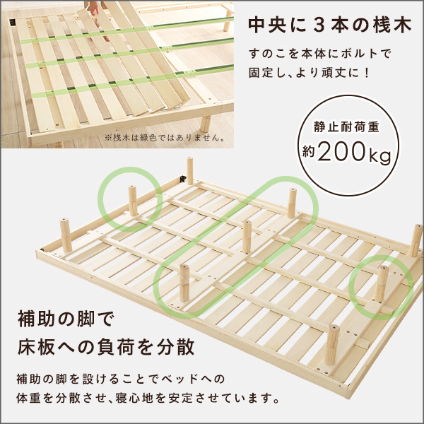 【ポイント】 3段階に高さを調節できる脚付きすのこベッド ダブルサイズ! 北欧産パイン材はリフレッシュ、消臭、抗菌、防臭効果があります。 安心安全のF★★★★(フォースター)を獲得しました。 静止耐荷重は200kgと頑丈設計です。 通気性抜群で年中快適にお使い頂けます。 ベッドを並べてクイーンサイズ、キングサイズとしても利用可能です。 |