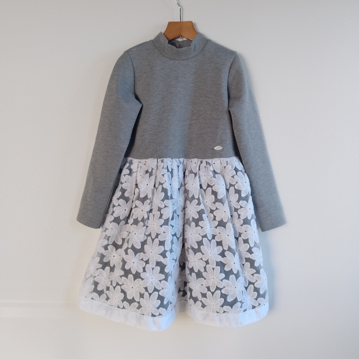 ローネックの薄いグレーポンチワンピースにマーガレットレースが付いたガーリーなワンピースです