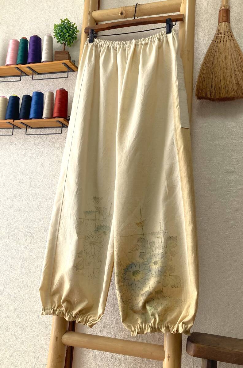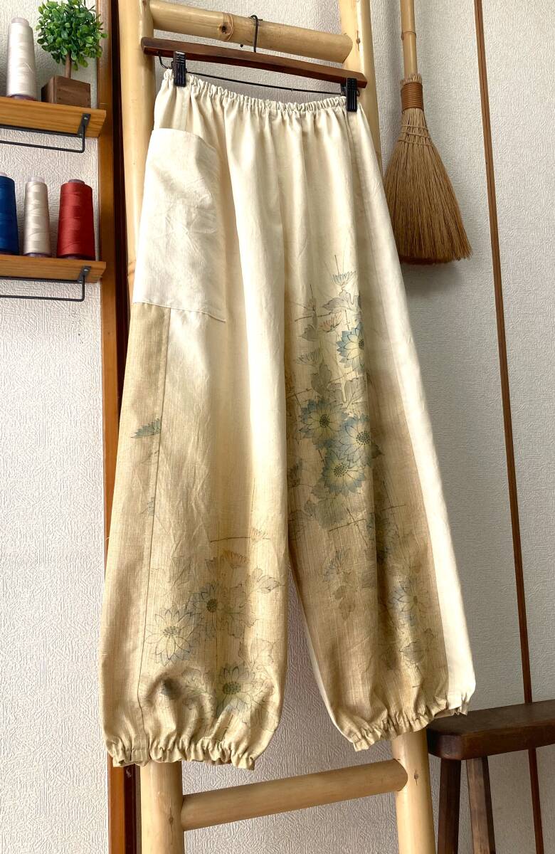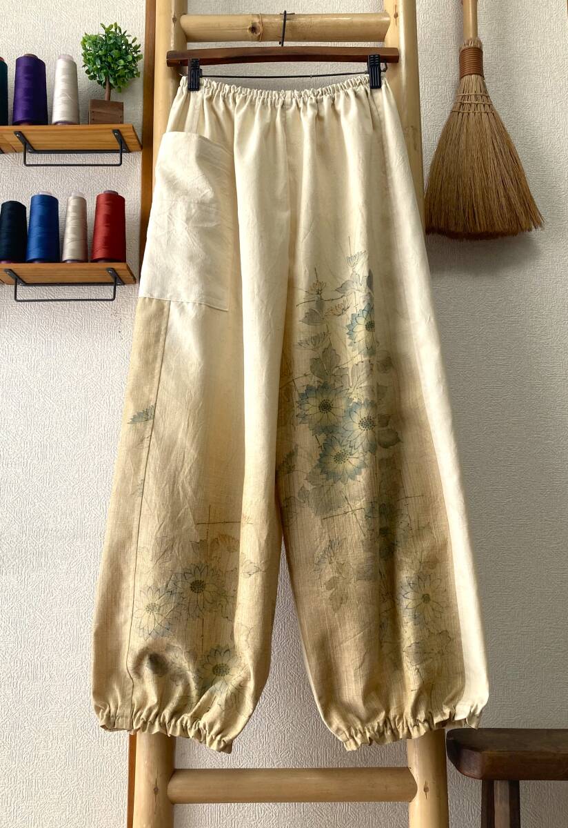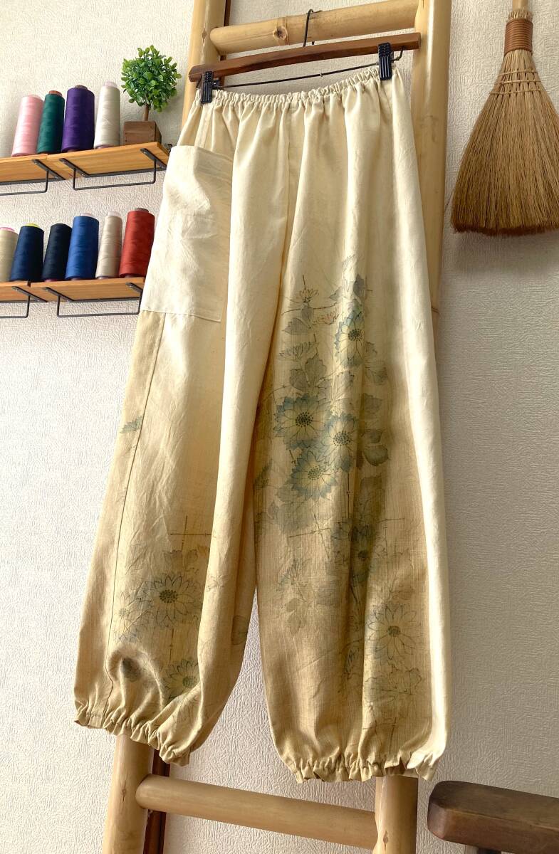 ![]() | 商品説明 ✽鎌倉まるか堂✽ ~もんぺ風~ ゆったりらくちんパンツ ~作品詳細など~ ✽総丈92cm 股下62cm 渡り幅37㎝ 裾幅18cm ✽ウエストサイズ 60㎝~120㎝ ・目安として、50㎝~100㎝=S~M 55㎝~110㎝=M~L 60㎝~120㎝=L~LL以上 ✽生地…絹。普通厚、光沢ほんのり、程良いシャリ感とハリ感、さらっとして柔らかく温もりある手馴染み良いしっかりした紬生地。 ・(無理にアイロンを掛けず洗いざらしのままの風合いでも穿き愉しめます!) ✽色柄…渋めの淡黄色で裾に向かって濃くなる色調。水彩画のような筆タッチの淡い彩りで描かれた庭の咲く菊を描いたデザイン。 ・() ✽美点…アンティーク感ある色味と風合いですが優しい生地&丈夫さん!渋く仄かに色づく菊花は情緒がありかなり魅力的な全体観に仕上がった作品です! ・(しっかり水通しをした生地。裾は程良く絞ったゆったりまるっこいシルエット&裾のひらひらが大きめです♪気軽に洗濯出来て扱い易いのも魅力です!) ✽特に浅くも深くもない一般的な深さの股上です。 ・裏地はついてませんので必要に応じてぺチやタイツなどのアンダーを併用して下さいませ。 ・アウトポケットが一つ付いてます。 ・ウエストはゴム2本、裾はゴム1本、ともに調節穴有り。 ・お直しは無料(裾上げなど簡易なお直し)ご連絡時にお願いします。 支払方法 ✽ヤフー簡単決済 発送方法 ✽ゆうパケット:追跡アリ(場合により定形外郵便) ✽発送は神奈川県からです。 注意事項 ・解き生地の場合は染み、焼け、解痕、折皺等ある場合がございますのでご理解をお願い致します。 ・商品はノークレーム・ノーリターンでお願い致します。 ・評価内容に問題のある方のご入札は取り消す事もございます。 ・質問はお気軽にお尋ねくださいませ、出来るだけ詳しくお答え出来るよう努めます。 ✽☆☆☆✽☆☆☆✽☆☆☆✽☆☆☆✽☆☆☆✽☆☆☆✽☆☆☆✽☆☆☆✽☆☆☆✽☆☆☆✽☆☆☆✽☆☆☆✽☆☆☆✽☆☆☆✽☆☆☆✽☆☆☆✽☆☆☆ ✽繊細で優美にあやなす柄や簡素単純でありながらも完成された柄など古から大事に受け継がれてきた和柄のもつ潜在能力は無限の可能性があります、 そんな和柄を活かした着物リメイクを気軽に纏い普段生活に自然と取り入れて頂けたらこの上なく嬉しく思います。和柄万々歳(*'▽') |