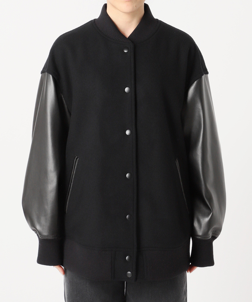 素材:表地:毛100% 袖部分:合成皮革 裏地:ポリエステル100% リブ:アクリル62%、毛27%、ポリエステル10%、ポリウレタン1%
