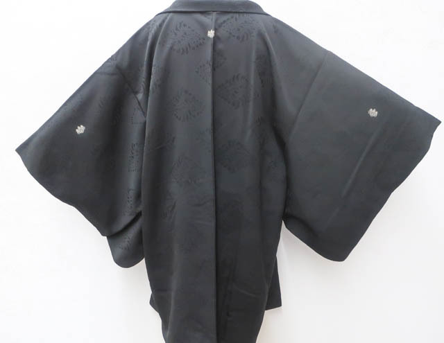 リサイクル商品のため、左袖に薄汚れと羽裏に薄しみがございますが着用可能なお品です。 地色は 黒 です。 1枚目の画像が近いお色かと思われます。 素材は正絹です。 |