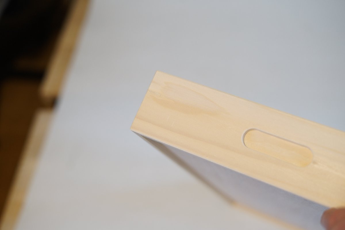 天然木由来の色味や木目から、表と裏とで若干異なり、ツートンのように見えます。