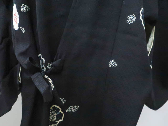 リサイクル商品のため、全体所々にしみ汚れがございますが着用可能なお品です。 地色は 黒です。 1枚目の画像が近いお色かと思われます。 素材は正絹です。 |