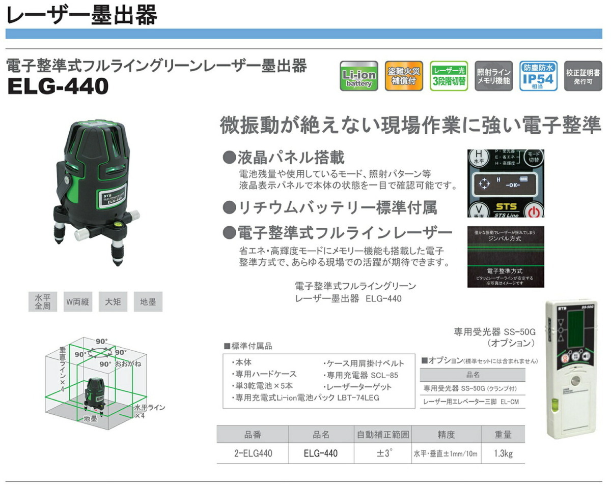 エス・ティ・エス 電子整準式グリーンレーザー墨出器 ELG-440(標準セット)受光器・三脚は別売