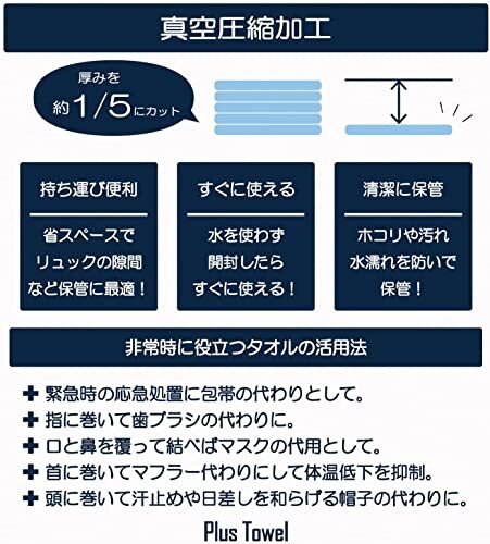 説明 【商品名】プラスタオル FT5P 【商品シリーズ】災害・緊急用圧縮タオル 【商品サイズ】タオルサイズ(広げた大きさ):82×34cm パッケージサイズ:36.5×22.5cm 【商品重量】パッケージ:約335g タオル1枚当たり:約62g 【素材】綿100% 【生産地】日本