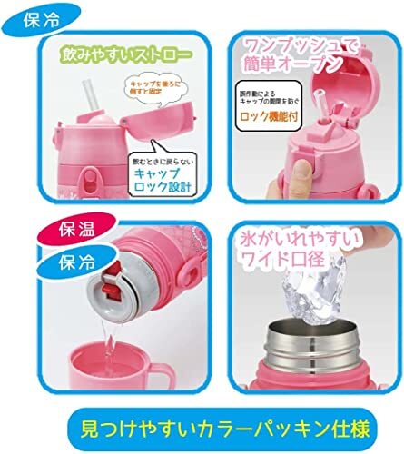 ストロー飲みやコップ飲みもできる2WAYタイプ 丈夫で透明度の高いPET樹脂を使用したストロー飲み口ボトル ストローの飲み口で飲む練習にぴったり! 飲む時にキャップが戻らないキャップロック設計で飲みやすい プッシュ式で簡単楽々オープン 軽量・コンパクトなのでお子様でも持ち運びしやすい ショルダーベルト・名前シール付 底に衝撃を和らげるクッション付 熱い飲み物はコップ飲みがおすすめ 食器洗浄機・食器乾燥機使用不可