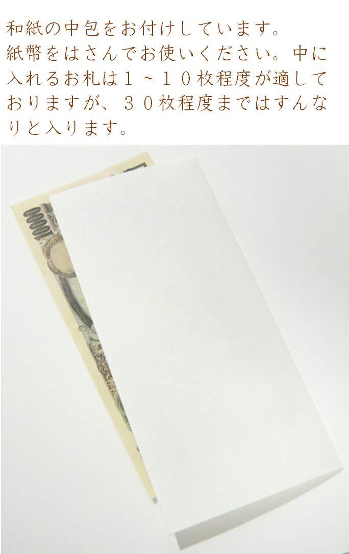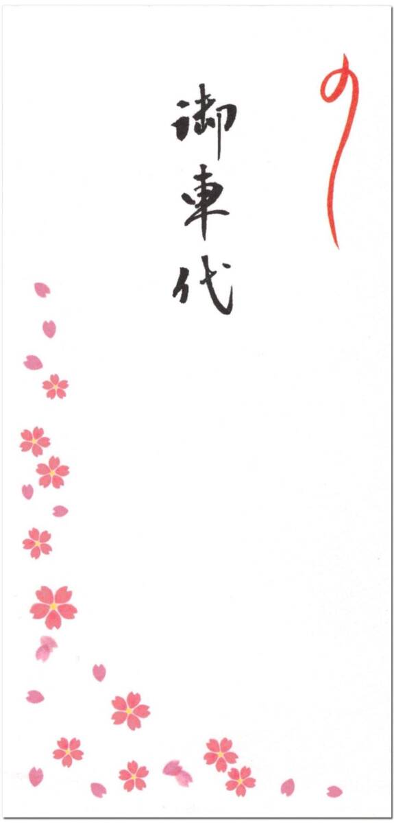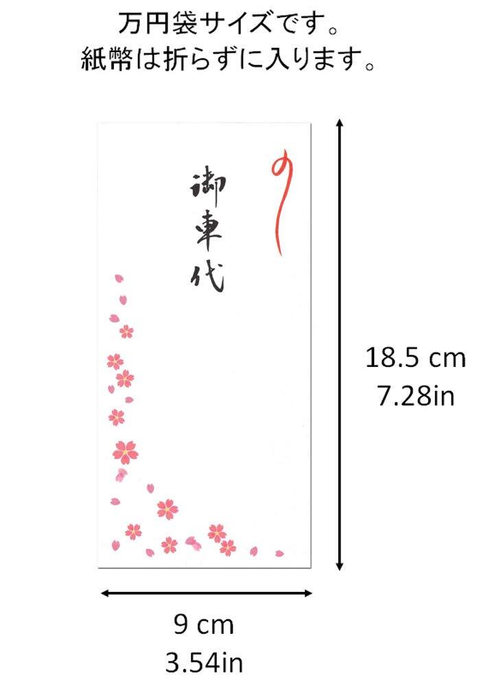 おめでたい桜の柄は季節を問わず、おめでたい式にお招きした大切な方への御車代にお使いいただけます。「御車代」の文字は専属の書家の筆文字を印刷し、温もりのある風合いに仕上げております。1500年の伝統を誇る、「越前和紙」を使用しています。越前和紙の表面には、刷毛目(はけめ)模様があり、独特の手触りと風合いがございます。和紙は厚く重厚な仕上がりです。坪量105g/m2としっかりしています。越前和紙の奉書紙の中包(二つ折り済)をお付けしています。お使いになると、紙幣が透けにくくなります。中包の折り目を右にして、紙幣は肖像(一万円は福沢諭吉)を上になるように入れて下さい。