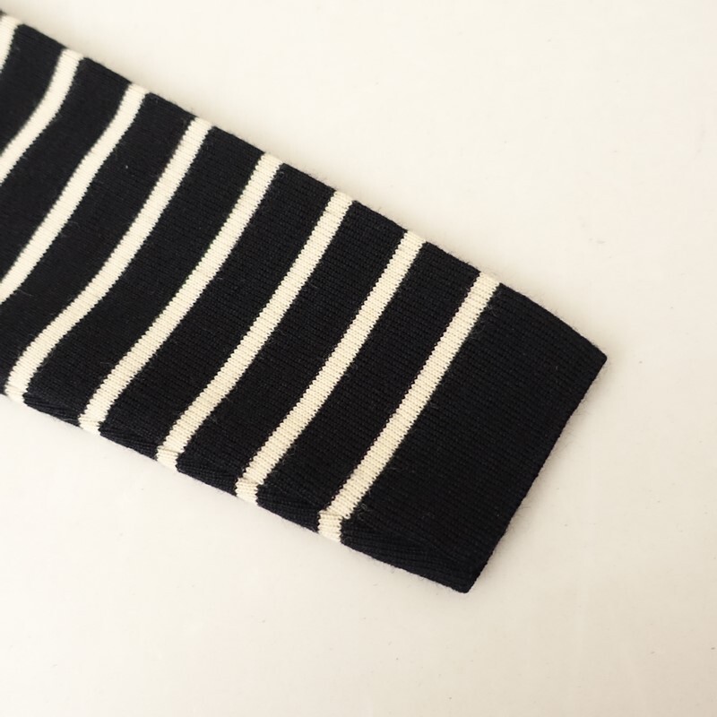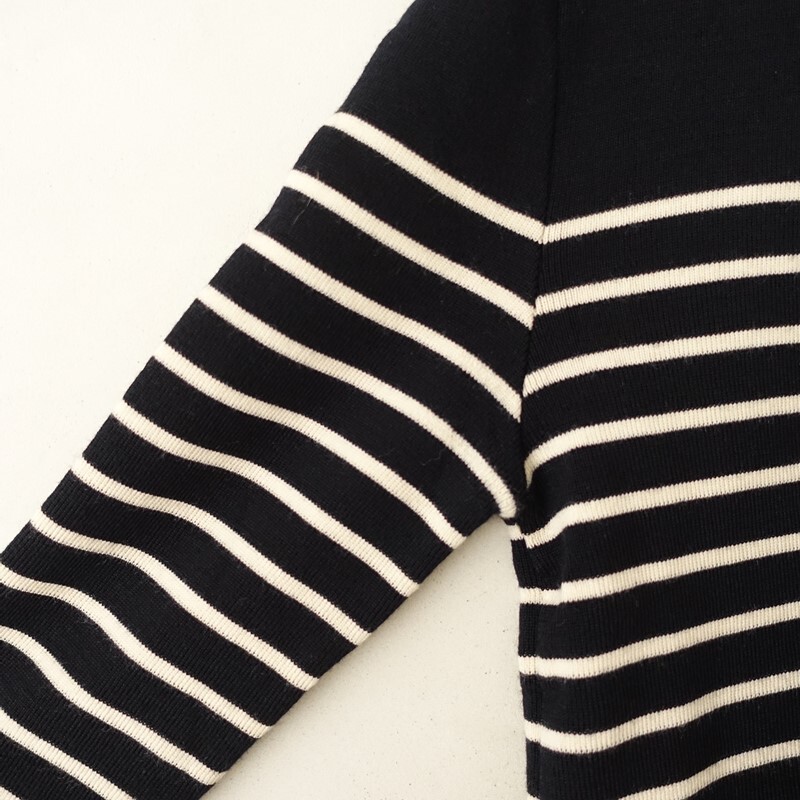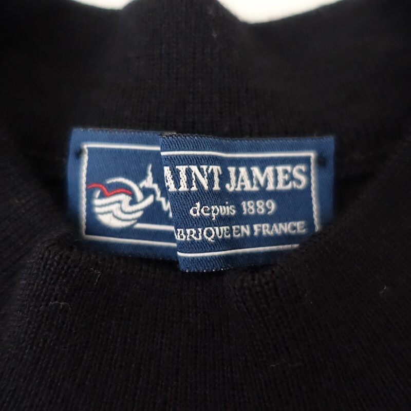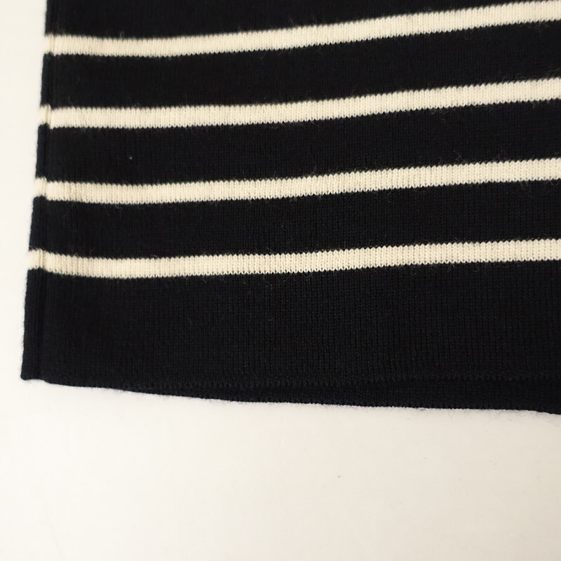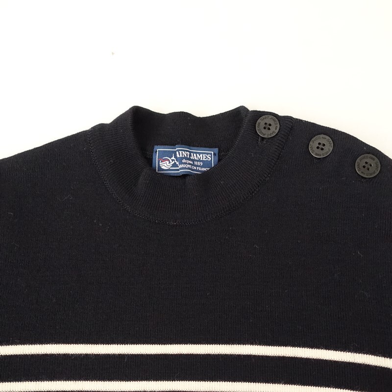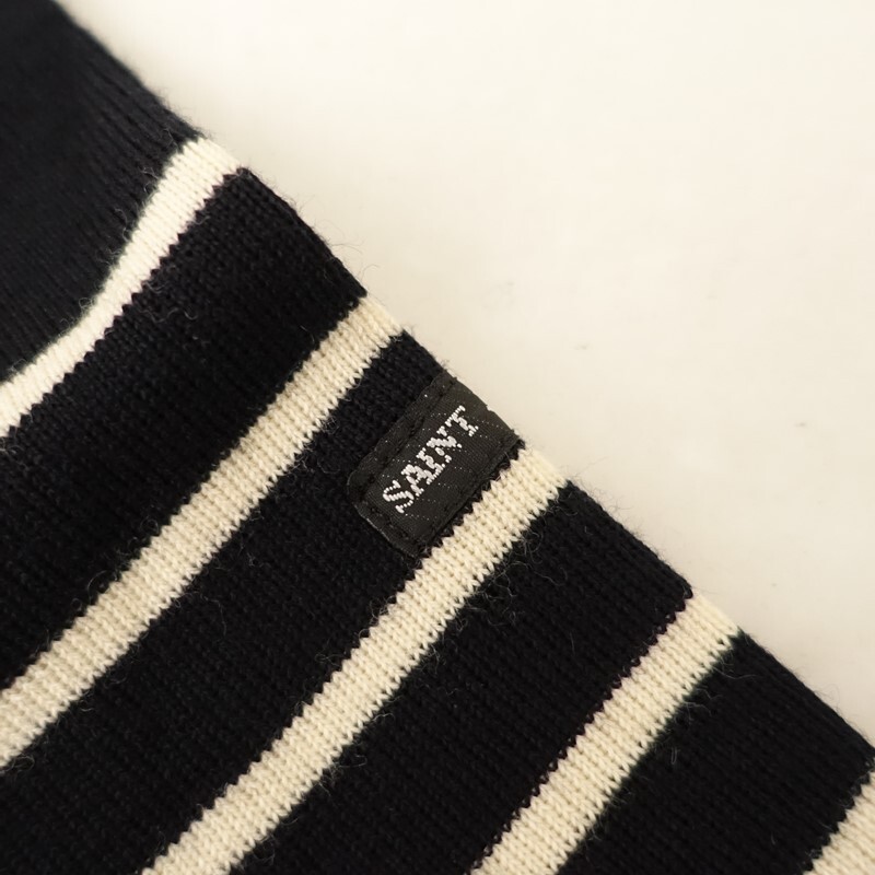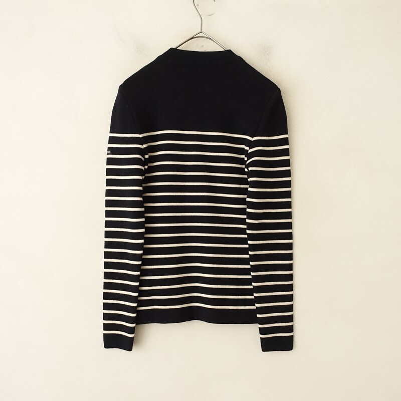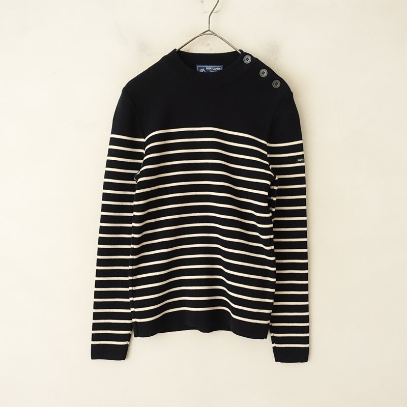 | SAINT JAMESの肩ボタン付ボーダーニットプルオーバーです。カラーはブラック×アイボリーのボーダー柄で、ウールニット地です。左肩にボタン付きのプルオーバータイプで着脱でき、襟ぐりはリブ編みで、左袖にブランドネームタグ付きです。 |