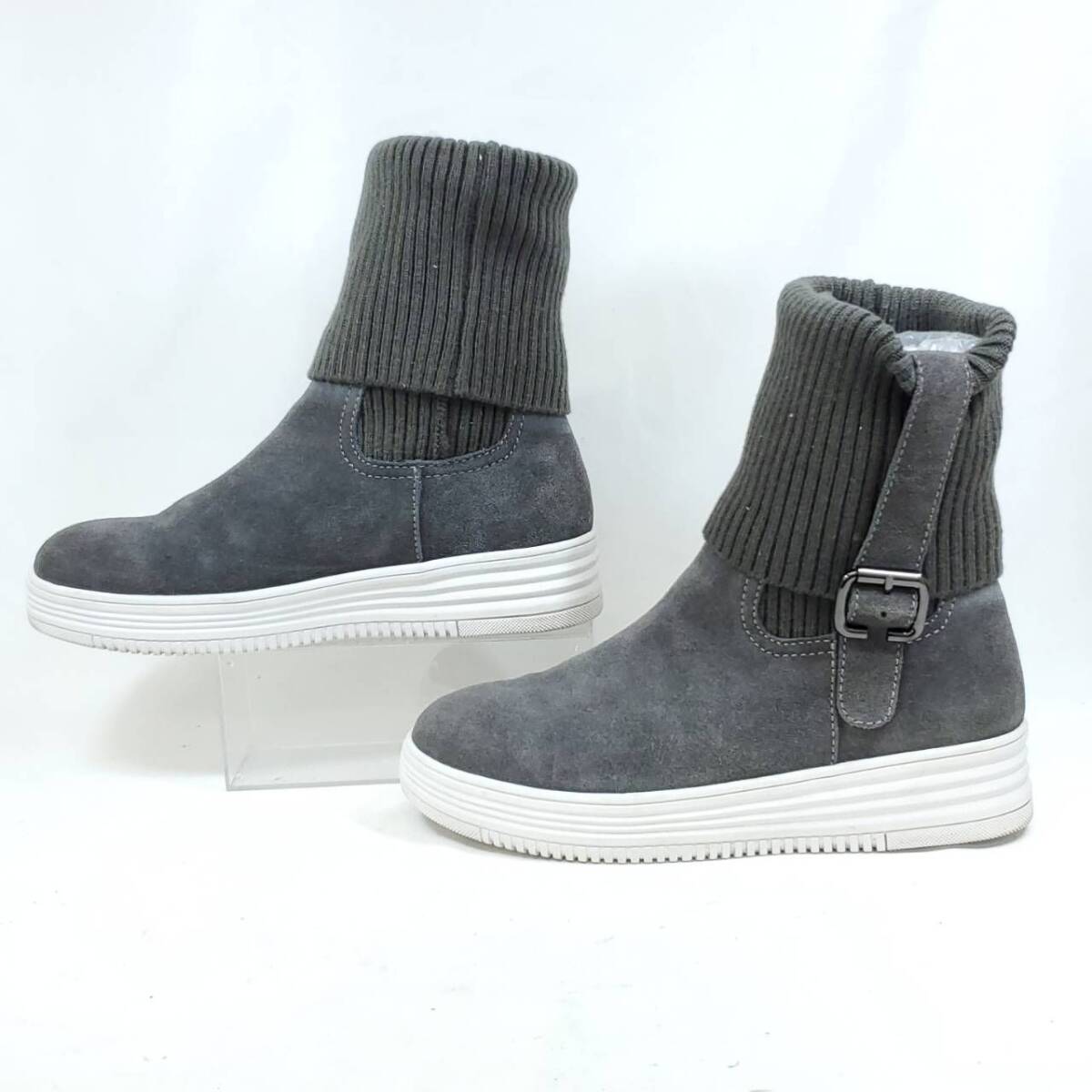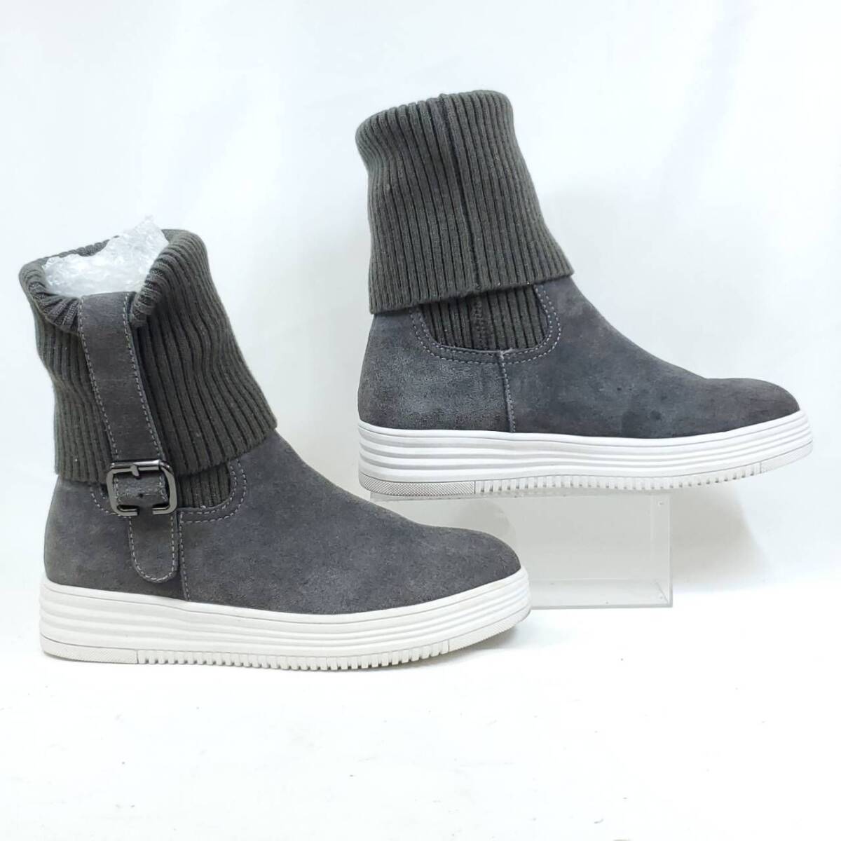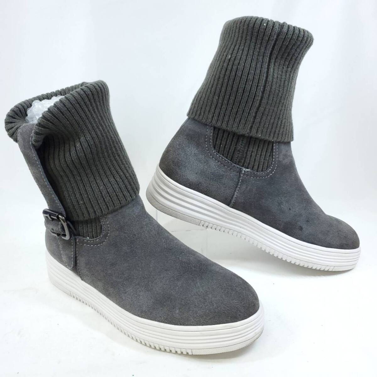 グレーのスエード素材とリブニットの異素材ミックスが、とってもおしゃれ。クッション性のある厚底ソールで歩きやすさ抜群。