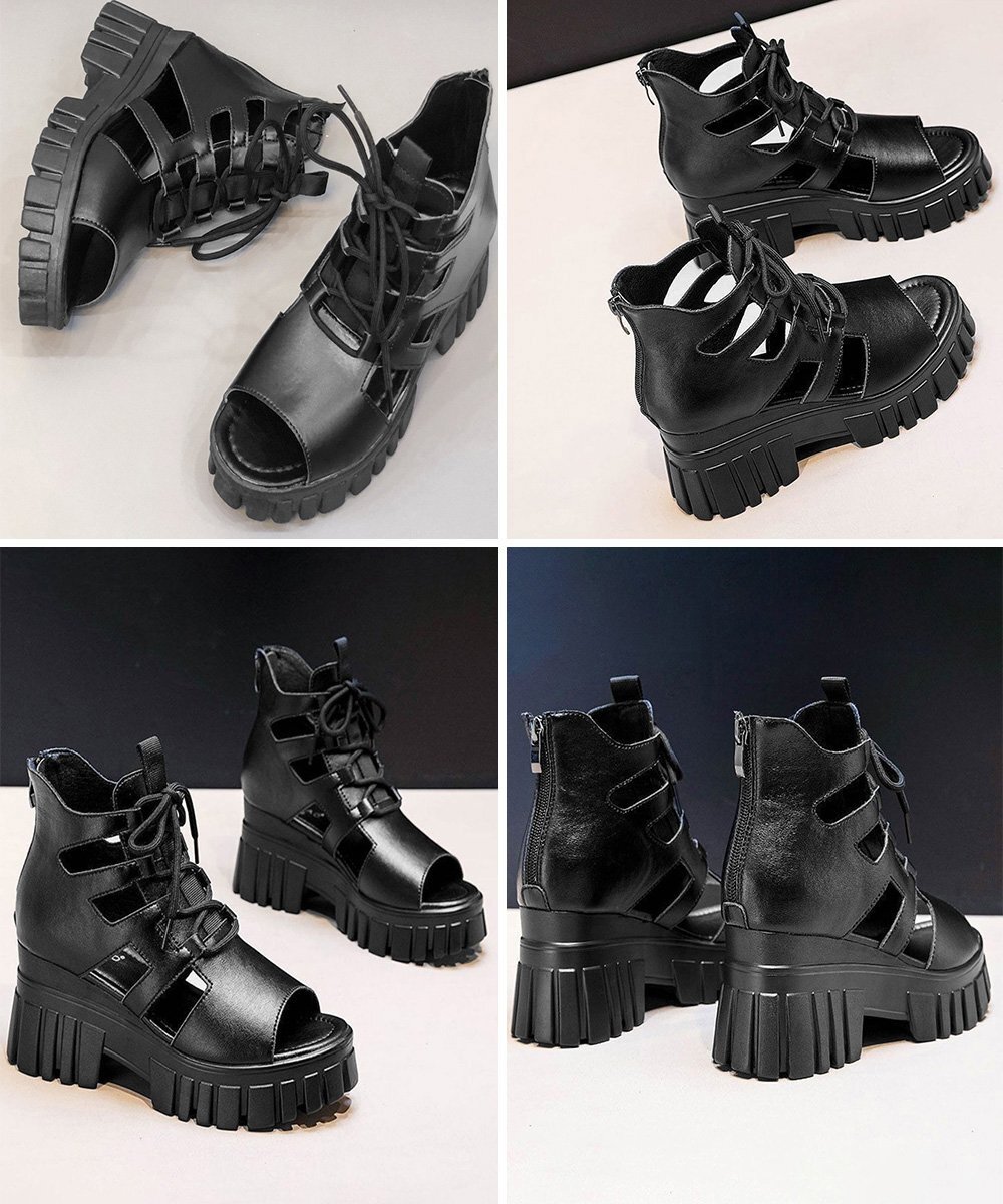 歩きやすい厚底サンダル 美脚脚長 レースアップシューズ サマーブーツサンダル ハイカットサンダル編み上げ 痛くない 韓国