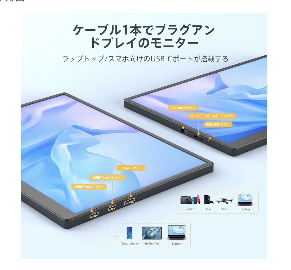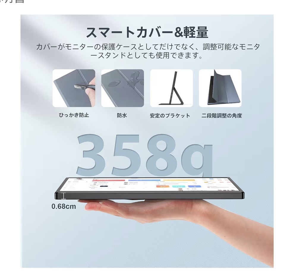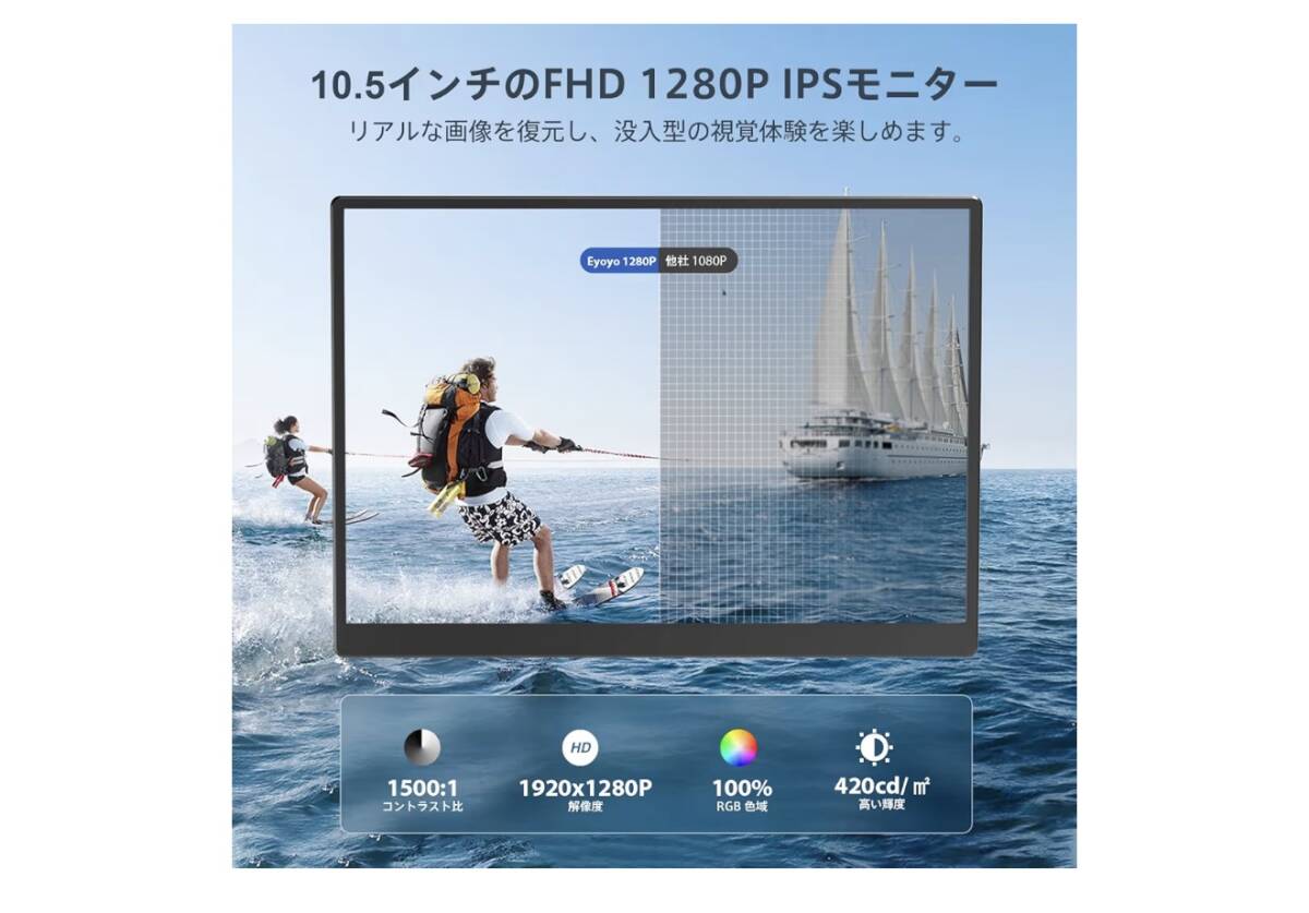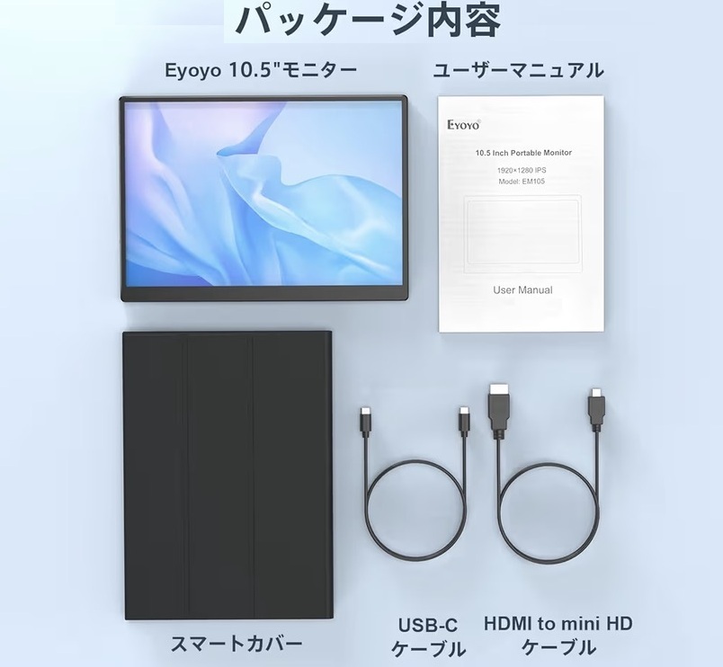| 2025年1月23日に新品購入した 「10.5インチ モバイルモニター フルHD1920x1280 100%sRGB色域 FHD1080p 完動品」です。 故障等もなく利用しておりましたが、大型に買い替えましたので、不要となりました。 1円スタートで売り切ります。 ◆特徴(メーカーより引用) 【1920x1280+100%sRGB色域&超明るく鮮明な画像】 10.5インチモバイルモニターには、フルHD1920x1280解像度と100%sRGB色域が搭載されており、常に色鮮やかで非常に鮮明な画像を確保しています。 420ルーメンまで超明るく、使用環境に応じて輝度を調整できます。 178°の広視野角パネルも搭載されており、水平角度に近い側面から見ても鮮明な画面を見ることができます。 【3:2モニター &より広い画面、より効率的】 3:2のアスペクト比では、画面の長さと高さは同じ測定値に近く、3:2ディスプレイは、開いている複数のドキュメントと画像を表示するための垂直空間を増やすことができます。仕事の便利さと効率を高めることができます。 【USB C全機能ポート】 USB Type-Cポートが搭載されます。お持ちの機器がType-Cオルタネートモードに対応していれば、 付属のUSB-C to USB-C ケーブルで接続することで、モニターへオーディオ信号とビデオ信号を転送する・電源供給がケーブル1本で行われます。更に、付属のUSBアダプタと電源用ケーブルを使い、モニターに電源供給を行えば、小型モニターを使用しながらType-C経由で接続しているPC・スマホなどの端末への給電も行われます。 【目に優しい】 コンパクトな外観と強力な機能が備えます。低ブルーライト技術機能により、作業画面を長時間見ている間も目の疲れを防ぐのに役立ちます。FreeSyncテクノロジーは、画面の引き裂きや凍結などの問題を解決し、より良い使用体験をもたらします。ビジネスで仕事画面をシエアすることに適用しています。 【広範な互換性&デュアルスピーカー内蔵】 1280P小型モニターは二つのUSB CポートとミニHDMIポートが搭載されており、ほとんどのノートパソコン、スマホ、PC、PS4、XBOX、Nintendo Switchなどに対応しています。 【デュアルスピーカー内蔵】 2つの高音質スピーカーを内蔵し、追加のスピーカーを接続せずに没入的なサウンド体験を楽しめます。このEyoyoモニターはラップトップPCのサブモニターだけではなく、ゲームモニターとしても最適です。また、スマホの画面を拡大してビデオを見るのにも実用的です。 【軽量で持ち運びに便利&多機能のカバー】 厚さは0.68cm、モニター本体は358gの重さなので、バッグに気軽に入れて、持ち運びに便利です。滑り止めのスマートカバーを付属して、安心のスクリーン保護を提供しています。この保護カバーは、角度が調整可能なモニタースタンドとしても使用できます。この小型モニターは旅行、仕事、ゲーム、ホームエンターテインメントなどの画面を拡大する必要がある場合に最適です。 ご不明な点がございましたら、事前にご質問願います。 即決対応はいたしませんので、終了までお付き合い願います。 質問欄からご要望頂いても回答いたしません。 ※当方、非喫煙環境です。 | ||