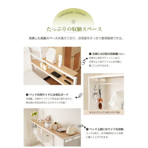 • 【たっぷりの収納スペース】充実した収納スペースを備えており、お部屋をすっきり整理整頓できる。1.左側には2段の収納棚があり、目覚まし時計やティッシュなど、日常でよく使うアイテムを手軽に置くことができます。充実した収納スペースを備えており、お部屋をすっきり整理整頓できる。1.左側には2段の収納棚があり、目覚まし時計やティッシュなど、日常でよく使うアイテムを手軽に置くことができます。2.ベッドの両サイドには有孔ボードを搭載。小物やインテリアを自由に飾れるので、男女問わず自分好みにカスタマイズ可能!3.ベッド上部にはワイドな収納ラックがあり、本や雑貨を広々と快適に置くことができます。4.フレームにはハンガーバー付きで、翌日の服を掛けるのに便利。衣類を整理しやすく、お部屋がすっきり片付きます。