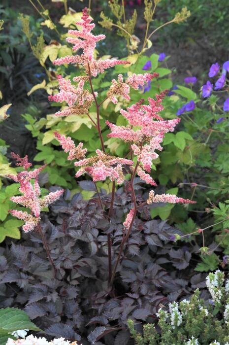 花の咲き方も、一般的なアスチルベのイメージと異なり、花茎が高く伸び 少し枝垂れるような特徴的な咲き方をします。花つき重視の品種のようにたくさんは咲きませんが、個性的な花型、控えめな花つきは、インパクトの強い銅葉には ちょうど良いおしゃれなバランスだと思います。
