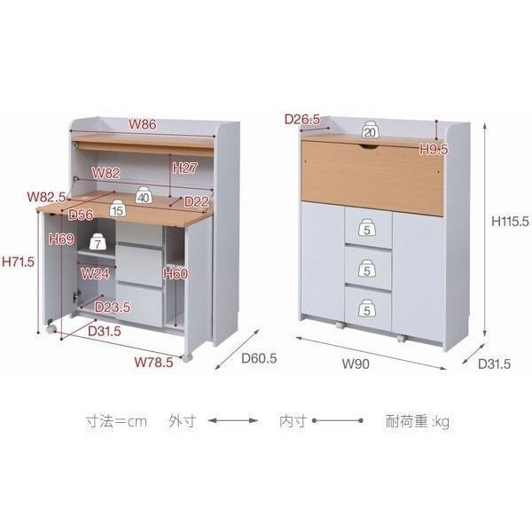 | 【カラー】 ホワイト×ダークブラウン、ホワイト×ナチュラル 【サイズ】 <外寸> 幅90.0×奥行31.5/60.5×高さ115.5cm <内寸> 上オープン部:幅86×奥行26.5×高さ9.5cm デスク作業面:幅82.5×奥行56.0×高さ27cm 左右扉内:幅24×奥行23.5×高さ60cm 引き出し:幅24×奥行22×高さ13(有効:上16/中15/下15)cm 可動棚:幅27.5×奥行23×厚み1.8cm(3.2cmピッチ11穴) 【材質】 本体:プリント紙化粧合板 天板:合成樹脂化粧合板(PVC) 【耐荷重】 上オープン部:20kg以下 デスク天板:15kg以下 デスク天板奥:40kg以下 引き出し:各5kg以下 可動棚:各7kg以下 【生産国】 中国 【梱包】2梱包でお届けします。 2-1 サイズ:80.8×33.1×21cm、重量:21.8kg 2-2 サイズ:94.8×37.6×16.9cm、重量:16.5kg 【その他】 ・可動棚:2枚 ・キャスター2個 ・合計1500Wの2口コンセント付き(コード長さ196cm) 【組み立て品】 お客様による組み立てが必要です。 【ご注意】 ・サイズ、重量は概算です。 ・商品カラーはご使用のモニターによって実際の明るさや色と異なって見える場合がございます。 |