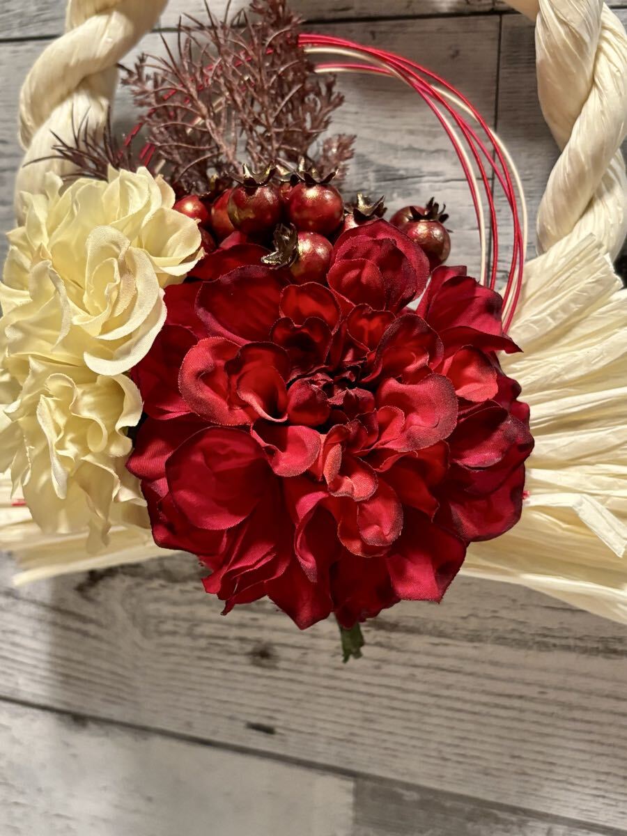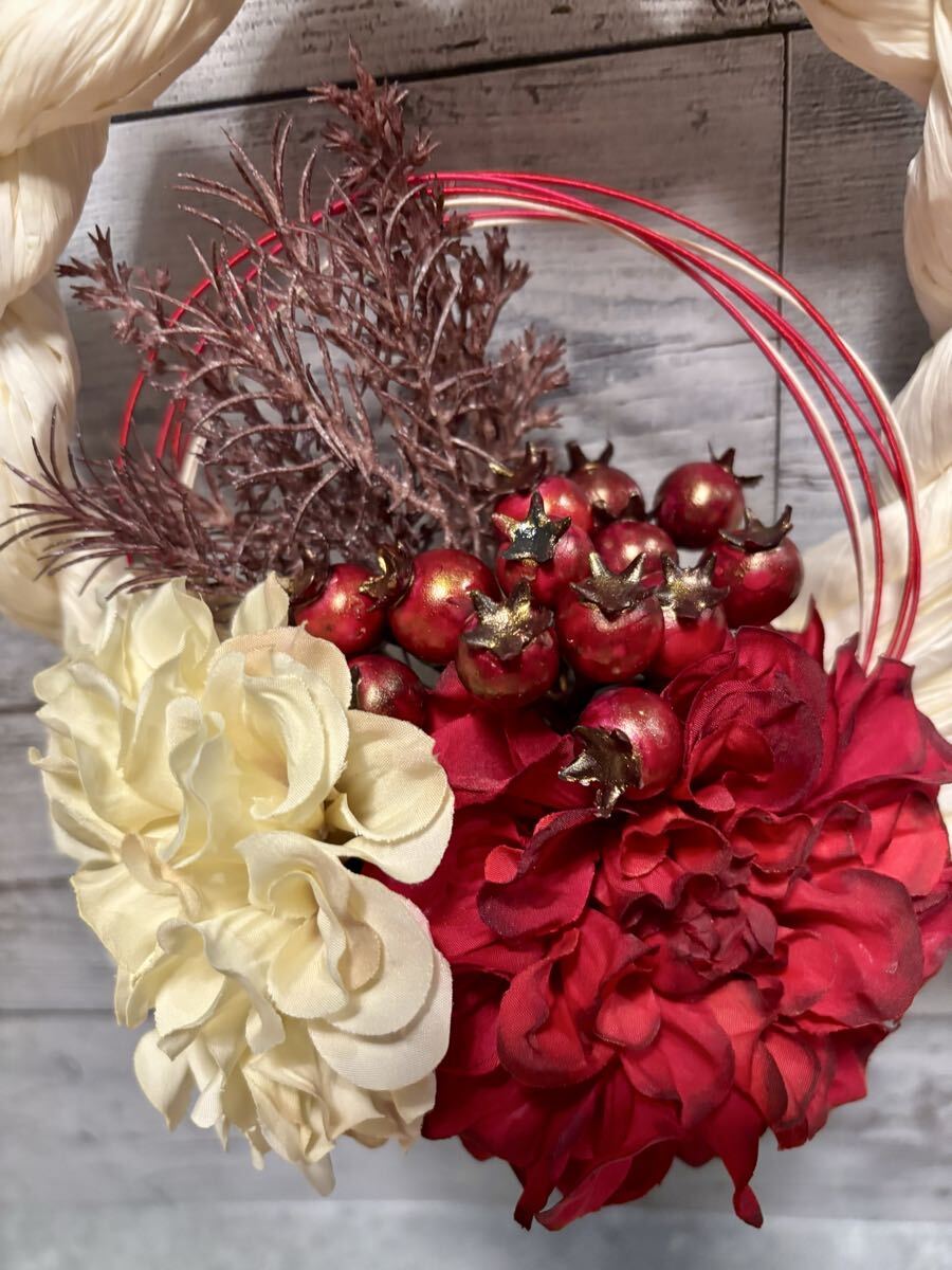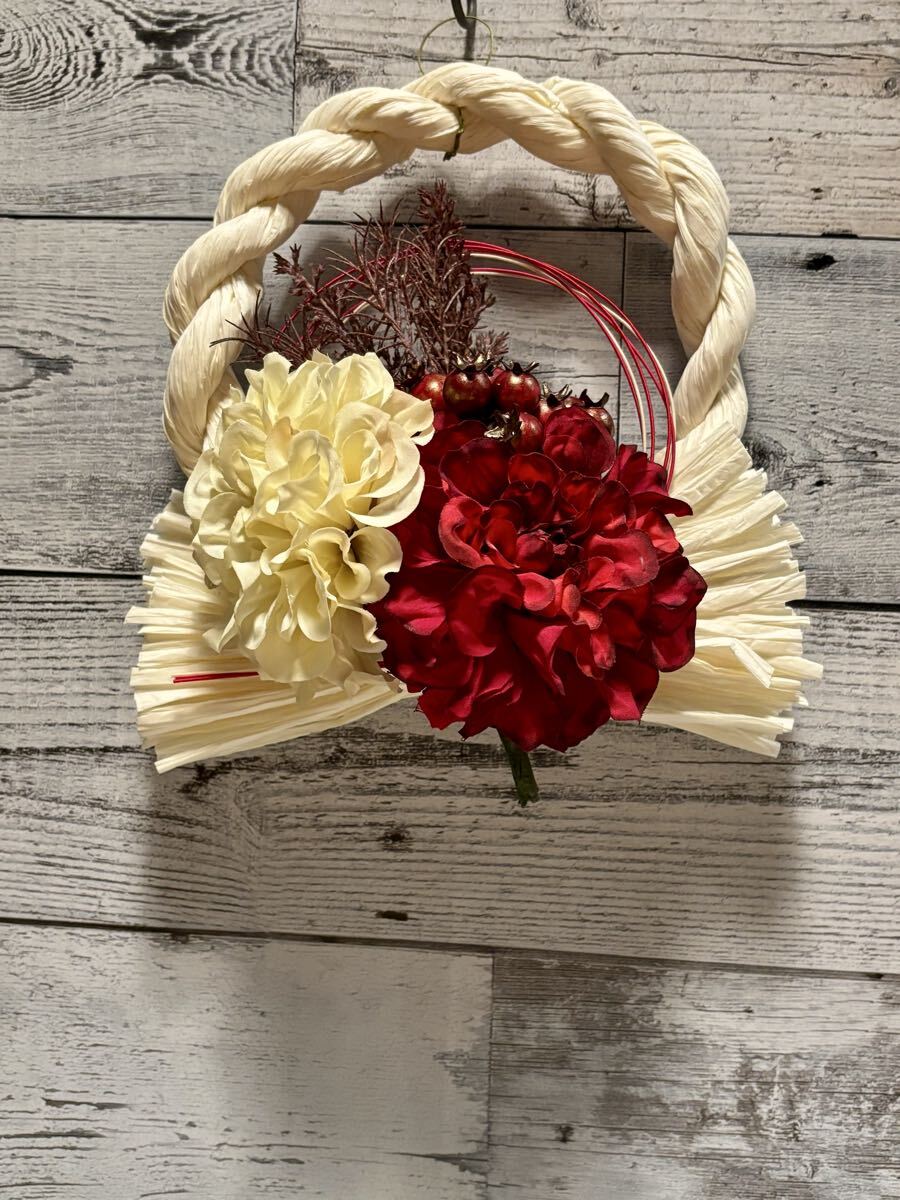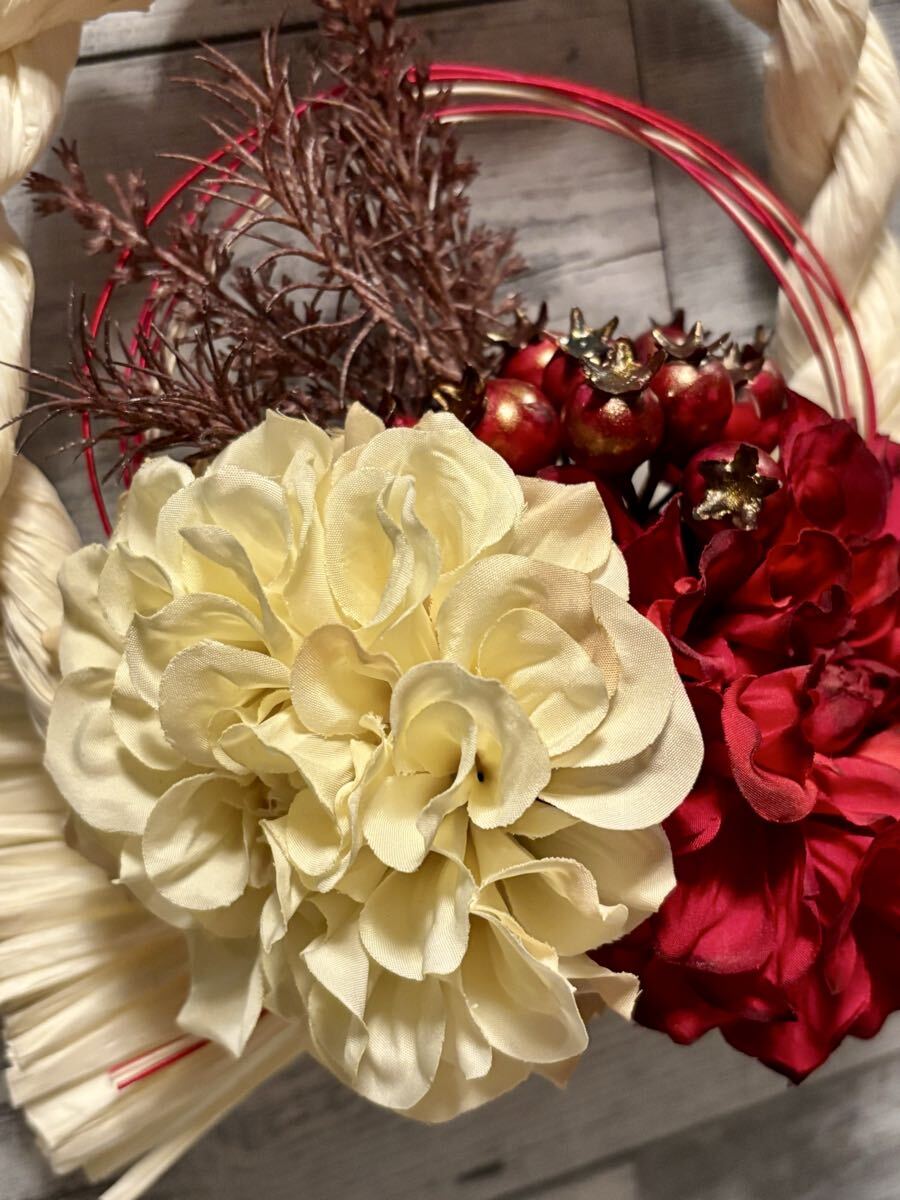 しめ縄部分はペーパーで、ホワイトになります。お花等は造花にてお作りしています