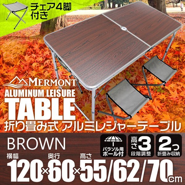| アルミ製 折りたたみ式 アルミレジャーテーブル 横幅120×奥行60 2つ折り収納 高さ3段階調整 55/62/70cm イス付き カラー一覧 | |