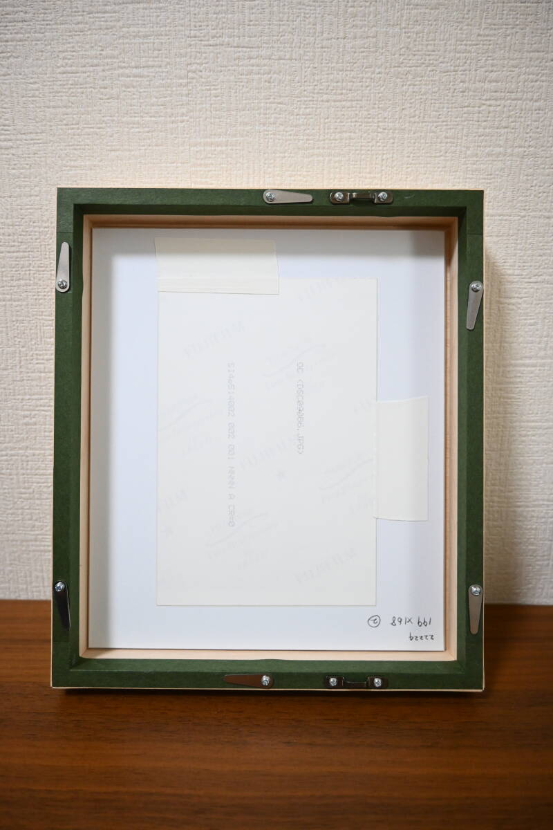 2013年頃に東京 恵比寿にある額装専門会社ジンプラさんにて オーダーして作った木製フォトフレームです。 当時で7,000円ほどしました。 メイン画像にある猫の写真は装着見本になり商品には付属しません。 木製のフレーム+壁掛け用のひもが出品商品になります。 ひもで壁掛けができますがひもを通す金具が横向きなので 横長写真は掛けることができます。 縦長写真には向きません。 外側サイズは 高さ21.5cm x 横18.5cm x 奥行3cm 内側の写真用サイズは 高さ12.9cm x 横幅9.8cmになります。 当方タバコは吸いません、またペットも飼っていません。