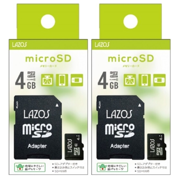 2枚セット microSDカード 4GB 格安・アダプタ付 L-B4MSD6 LAZOS microSDHC マイクロSD