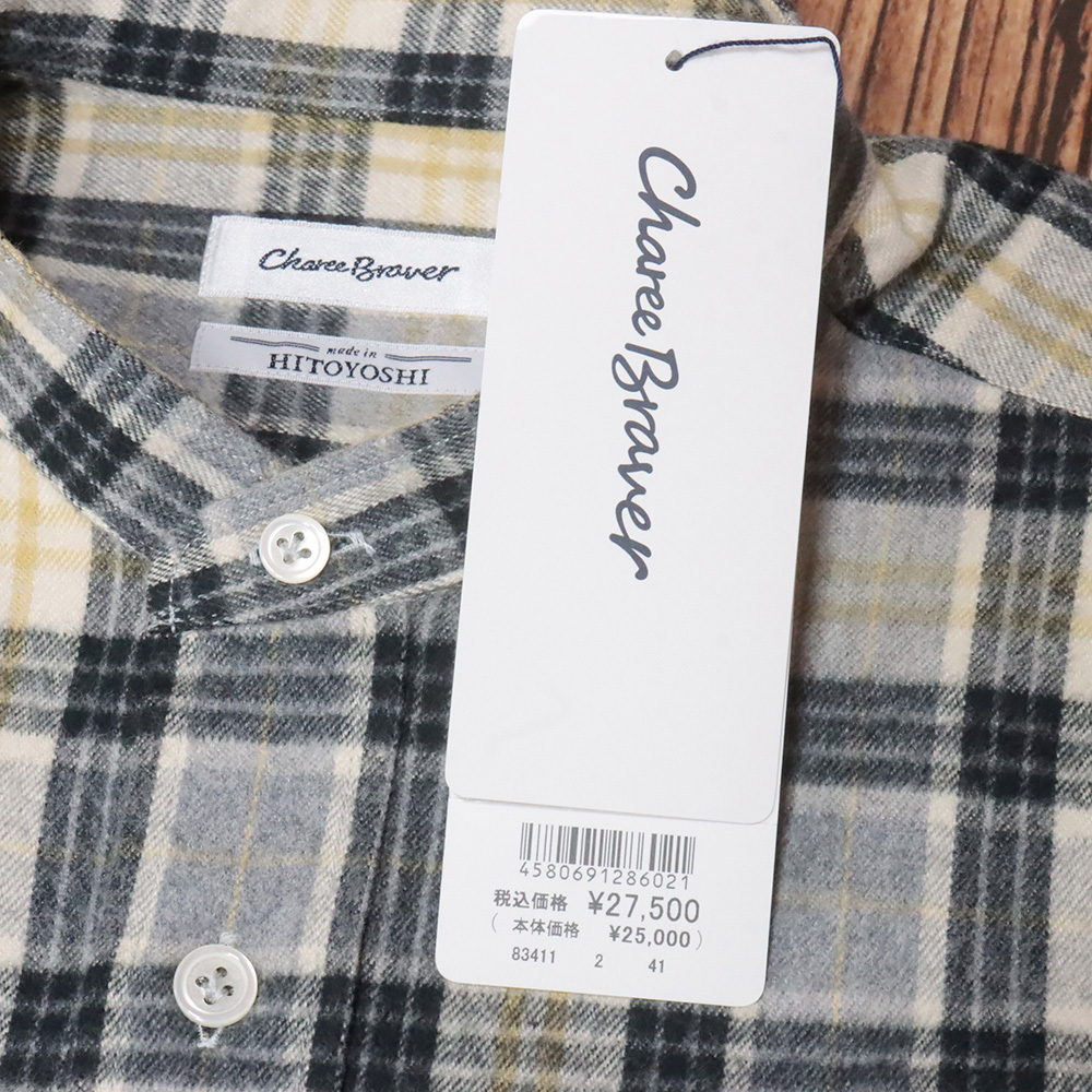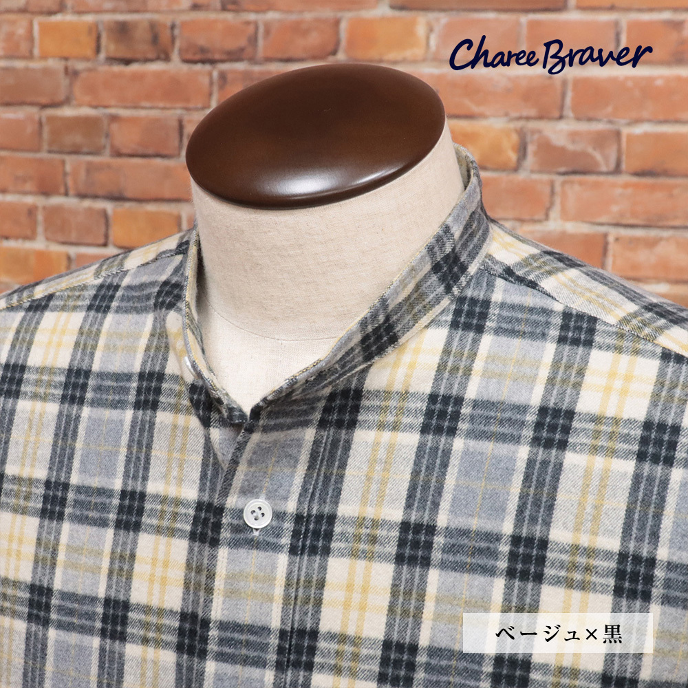 1円/秋冬/Charee Braver/3(L)サイズ/長袖ネルシャツ 日本製 バンドカラー チェック チャーリーブレイバー 新品/ベージュ×黒/ma253/
