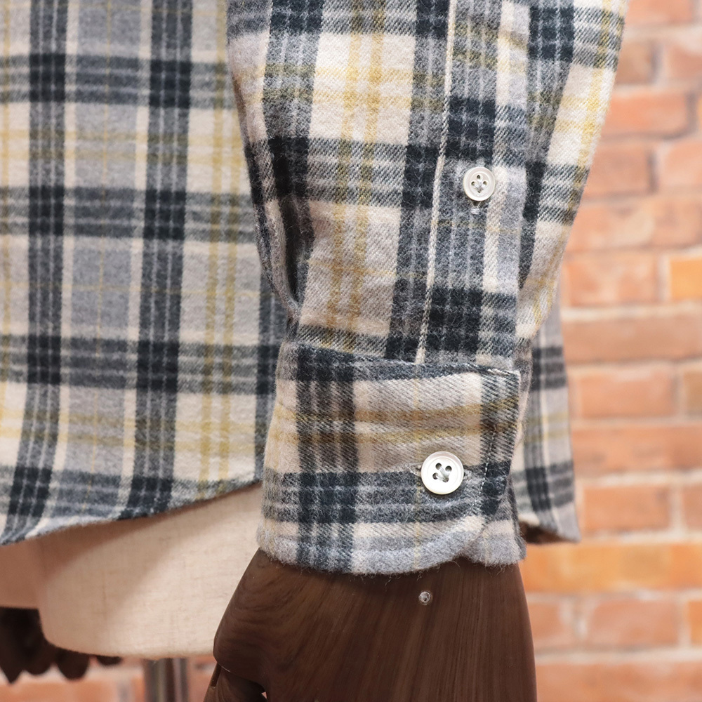 コーディネートの主役として活躍する長袖ネルシャツ。衿をバンドカラーにすることで顔周りの印象をすっきりと仕上げ、従来のネルシャツとは一味違う大人な雰囲気を実現しました。毛足の長いシャギー起毛のネル生地を使用することで、タータンチェック柄に柔らかい表情が生まれ、また肌触りの良さも追求しています。