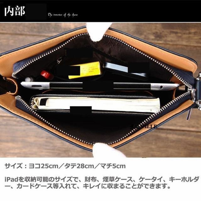 開け閉めしやすいファスナーです 金属製のカンで本体を接合して、耐久性と高級感が両立しています。 肉厚でしなやかな特注レザーを使用し高いクッション性とすぐれた撥水性能です ショルダーストラップの長さを調節できます、とても便利です。 このショルダーバッグはiPadを収納可能のサイズで、中のスペースが大きいので、9.7インチiPadだ送でなく、手帳、財布、テッシュなど日常物を収納可能です。