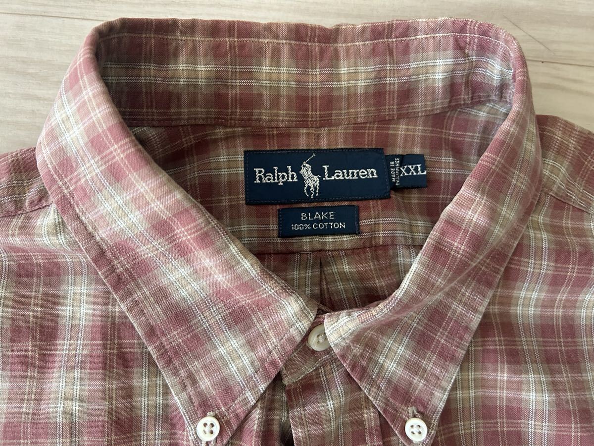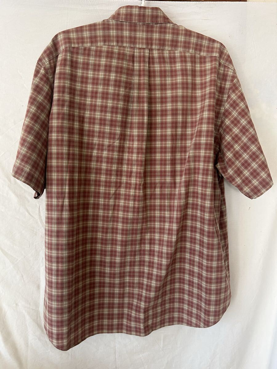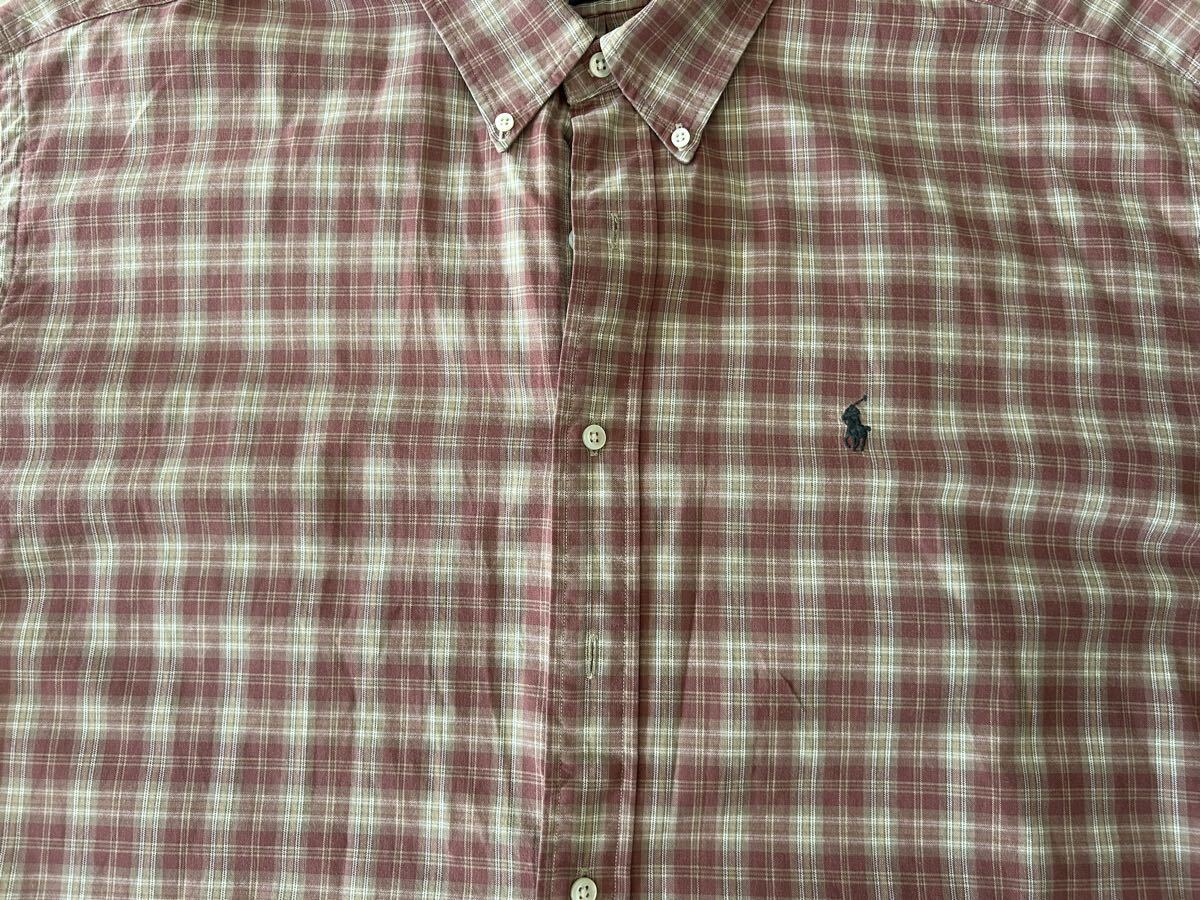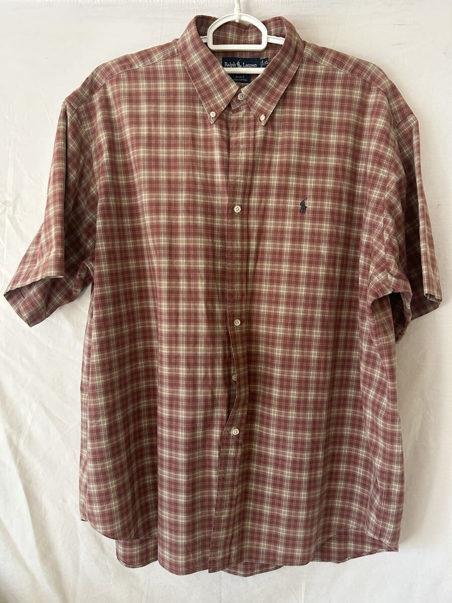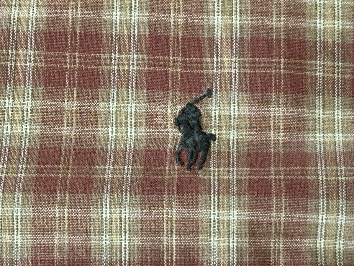 赤と茶のチェック柄の半袖ボタンダウンシャツ、ポロの刺繍入り。