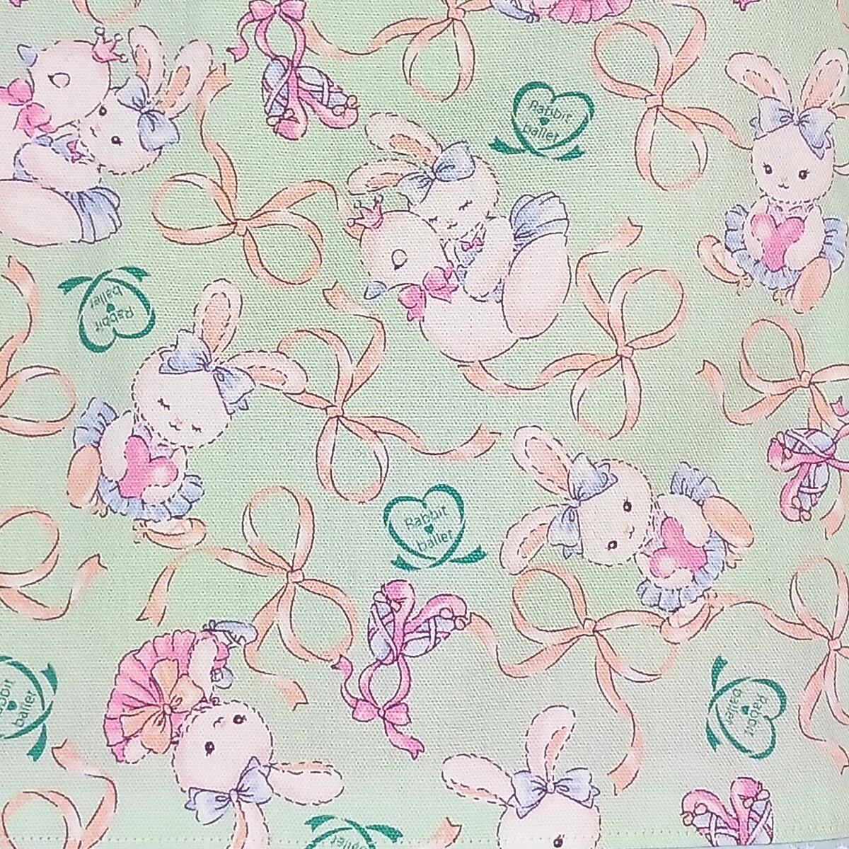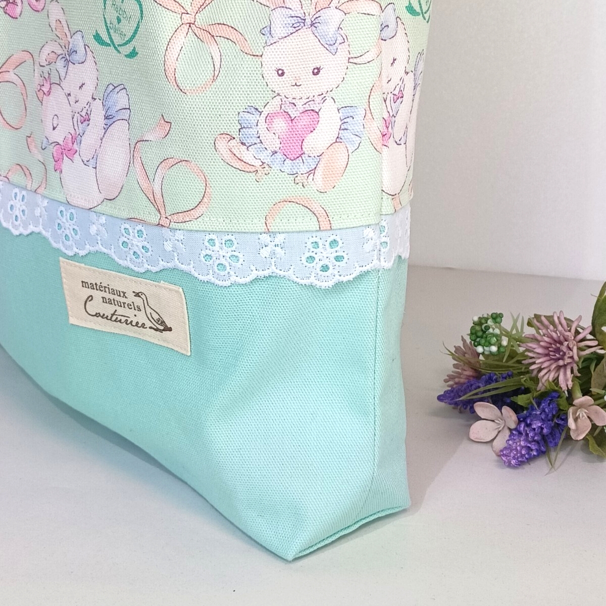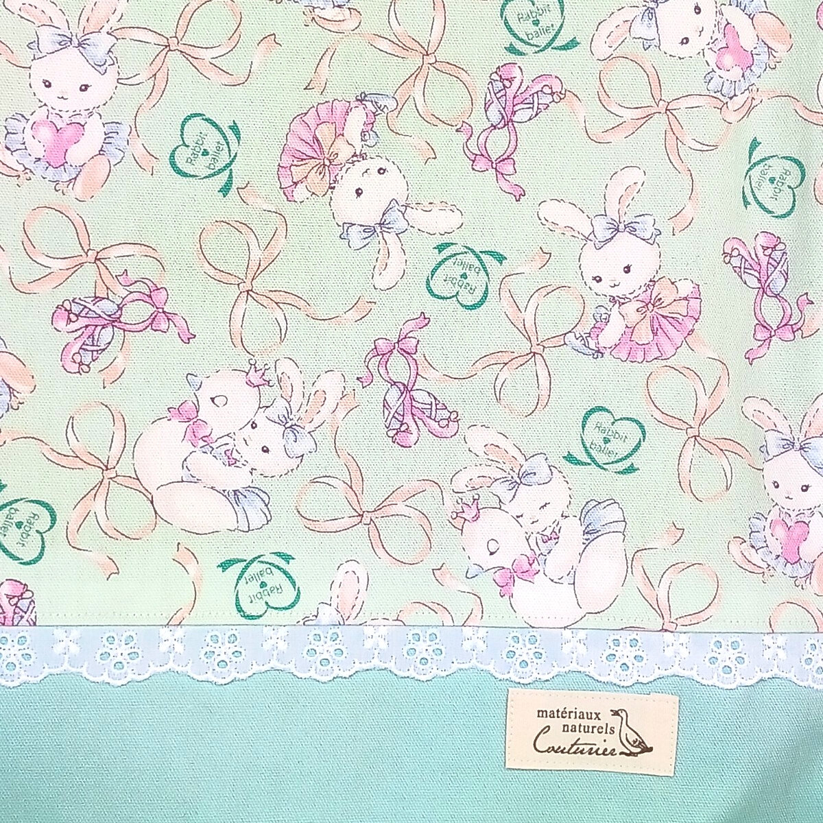 表地は、クラシカルモダンシュシュバレエラビット柄にミントグリーン色のオックス地で切り替え、コットンレースをつけました。