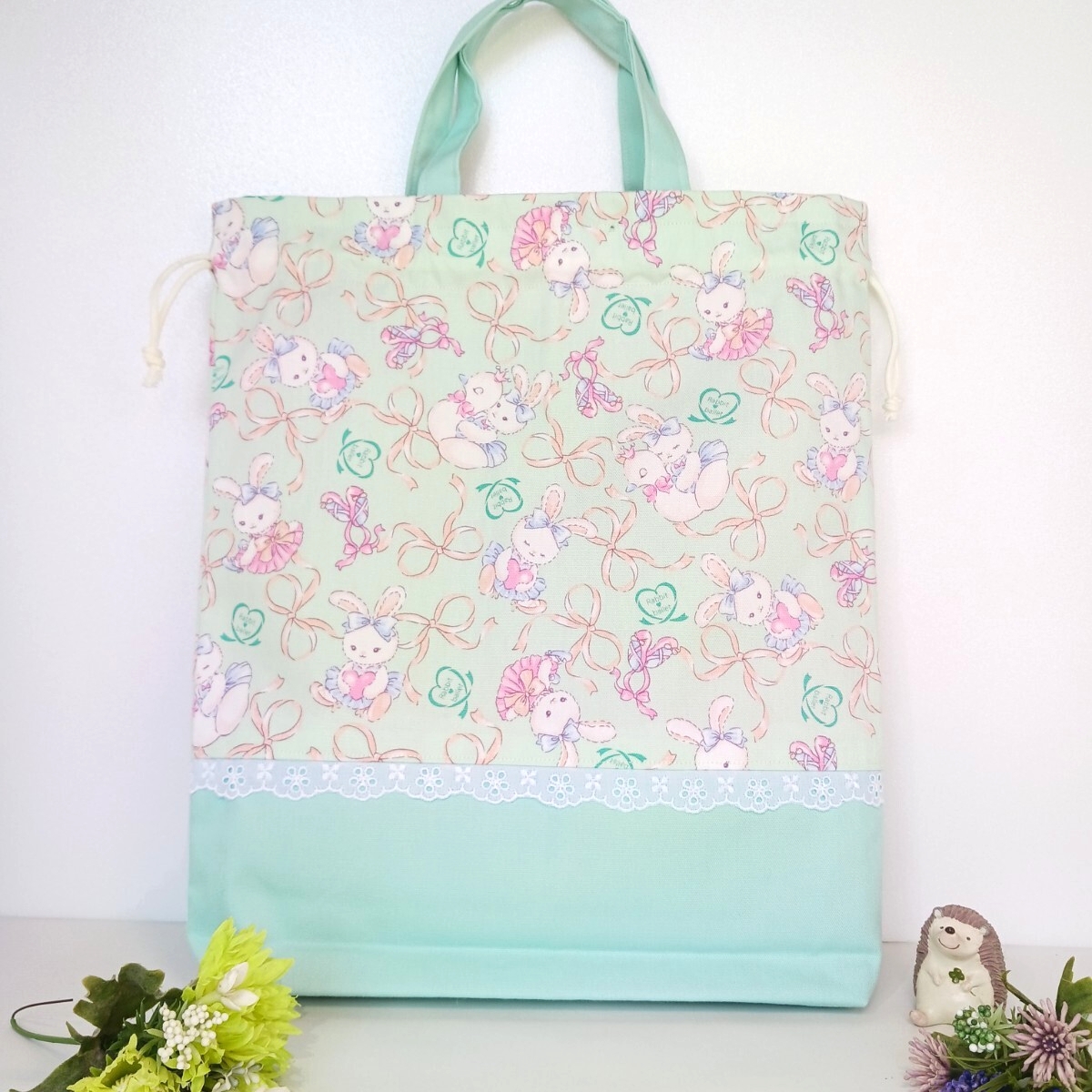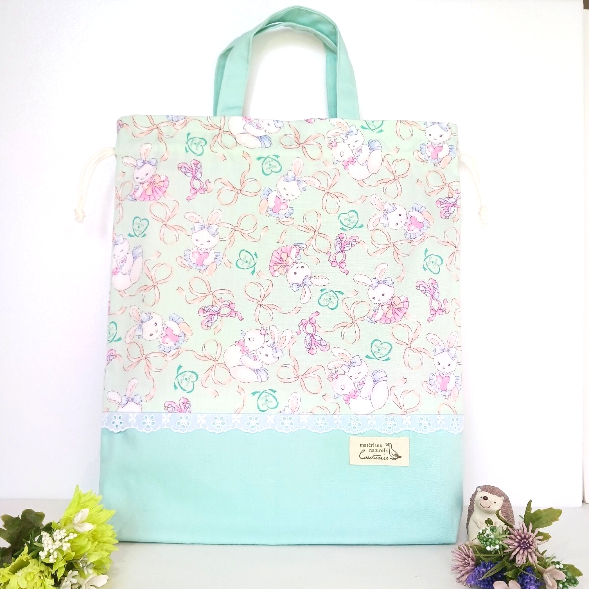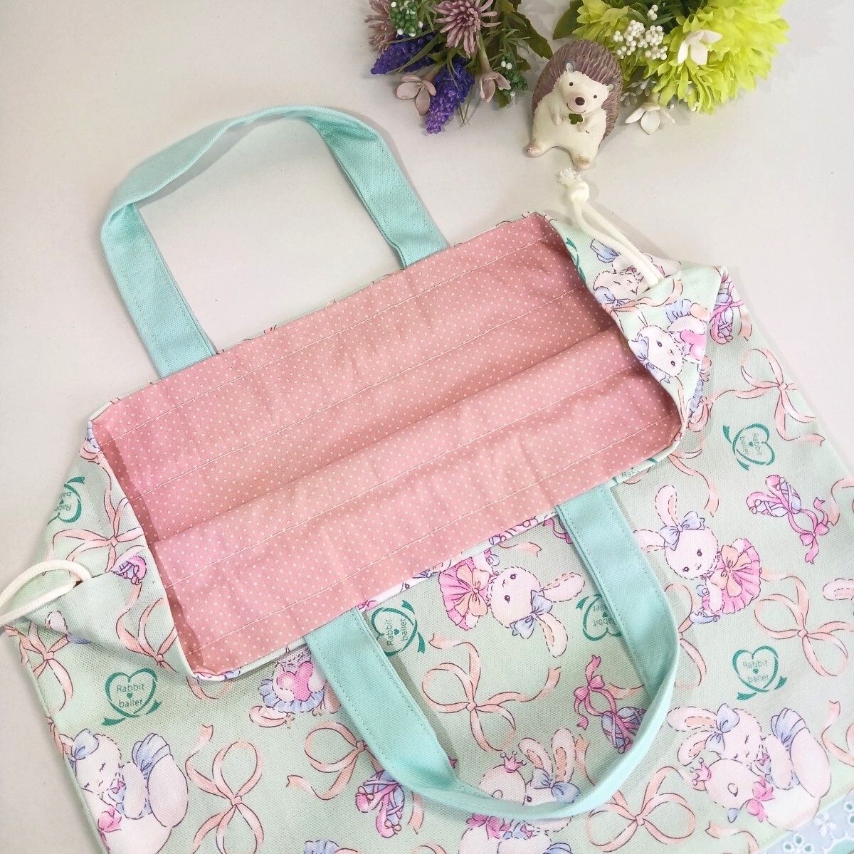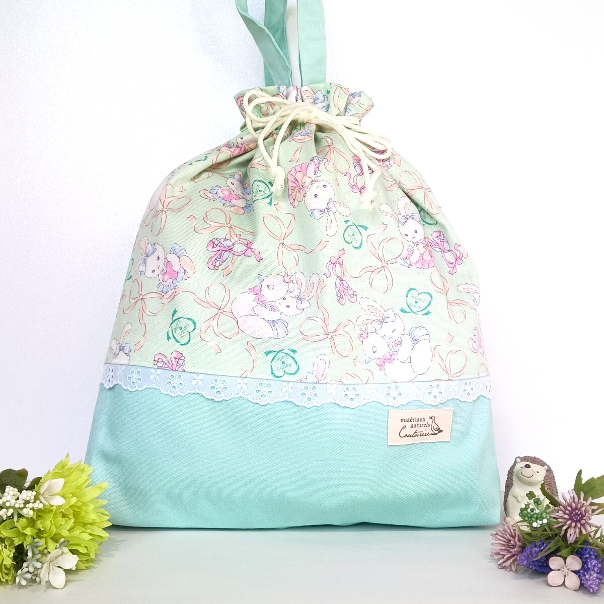 表地は、クラシカルモダンシュシュバレエラビット柄にミントグリーン色のオックス地で切り替え、コットンレースをつけました。