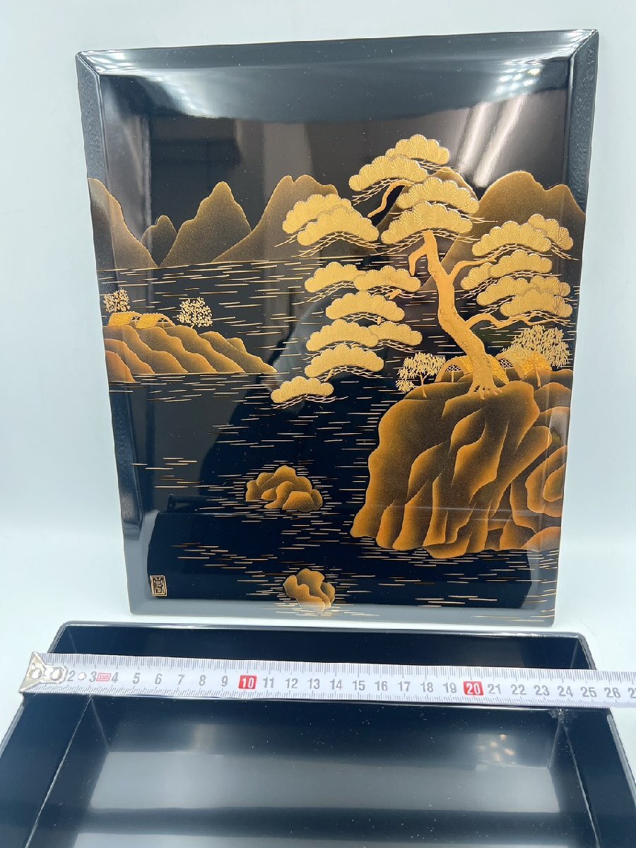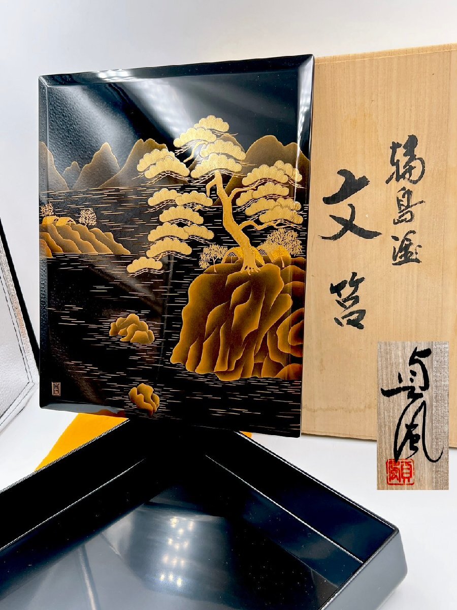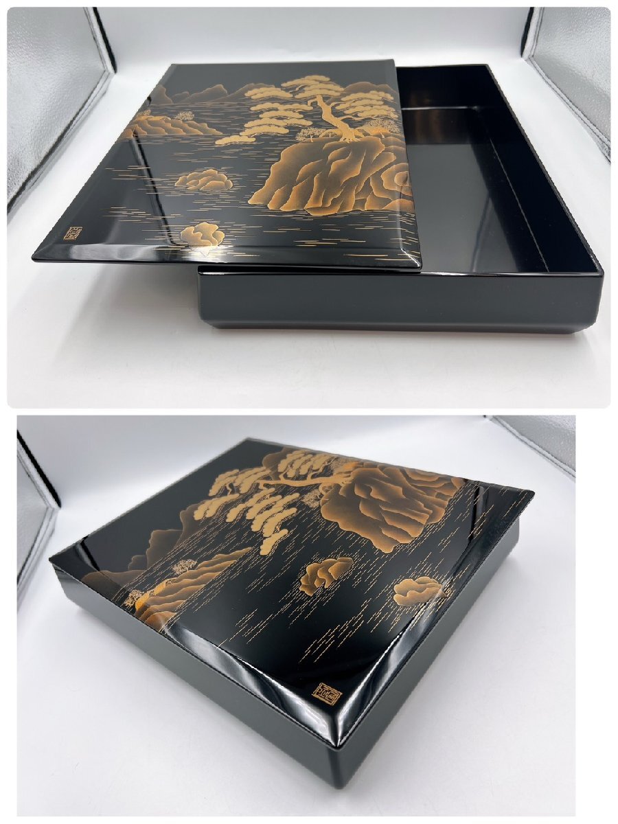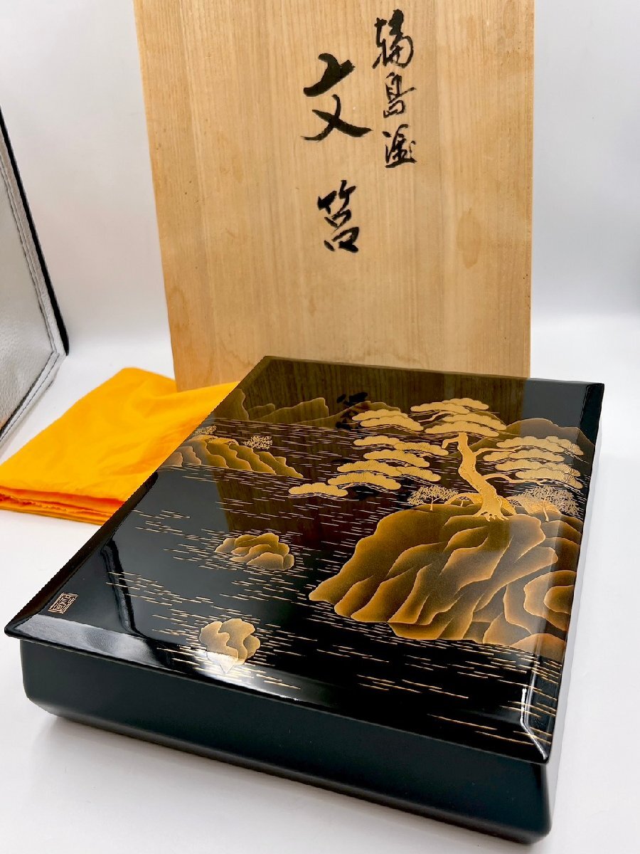 1円 高級 輪島塗 貞風 文箱 在銘 蒔絵師 組橋貞風 山/松/海/画 未使用 共箱 未使用保管品【AN010】