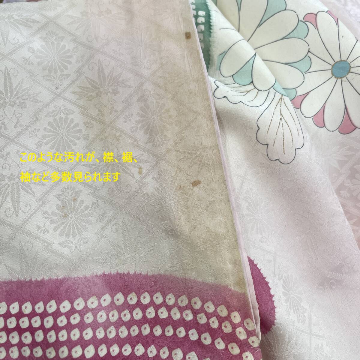| 商品説明 | アクセス有難うございます。 入札される前に、アプリでご覧の方は【もっと読む】を押し本説明欄をすべて表示し必ず最後までご確認下さい。 送料は下部に日本各地域別送料が記載されています。 送料、注意事項をご確認・ご了承の上、ご入札をお願いします。 こちらは譲り受けたお品です。 貸衣装処分品です 長期保管されていたお品物のため、たたみシワ、シミ汚れ、ヤケ、カビ臭、糸のほつれがあり、全体的に汚れが見られます 表地・裏地ともに目立つ破れはありませんでした その他、見落としているダメージがあるかもしれません 当方では譲り受けたままの状態でクリーニングやメンテナンスはしておりません 落札者様にて、クリーニングやメンテナンスが必要なお品物になります 画像ではライトを当てて撮影しているため、汚れが見えにくいですが画像で分かる部分は画像を出しておりますので、 拡大等して充分にご確認ください 生地の詳細などは記載がないため不明です 身丈:約162㎝ 裄丈:約65㎝ 袖丈:約102㎝ 前幅:約24㎝ 後幅:約31㎝ 素人採寸ですので、採寸ミスなどあるかもしれませんので目安としてお考え下さい 返品返金には対応できませんので、画像を拡大する等して十分に確認いただきご納得・ご了承の上ご入札ください 送料は下部に記載しております。(北海道からの発送です) 必ずご確認・ご了承いただきご入札をお願いいたします。 基本的にリサイクル梱包材にて発送いたします。 こちらのお品物は段ボール梱包は致しませんのでご了承ください 着物など衣類を複数落札し同梱希望の際はリサイクル段ボールを使用しての発送となり、 送料も変更になりますのでご了承ください。 落札後の発送に際し、提示した発送方法以外の対応は出来ませんので発送方法をよくご確認してご入札をお願いいたします。 (落札後は送料の変更は一切できませんので、ご納得いただきご入札ください) 送料にご納得いただけない場合は入札をご遠慮ください。 入札・落札後は送料にご了承いただいたものとし、いかなる理由でも送料に対するクレームは受け付けませんので必ずご確認の上ご入札ください。 輸送中に新たな不具合が発生する場合がございますので、動作の保証はしておりません。 当方専門知識がありませんので、専門的なご質問にはお答えできません。 すり替え防止のため、ノークレーム、返品交換、送料を含む返金は対応いたしません ご了承の上でご入札をお願い致します。 また、気が付かない見落し等あるかもしれませんので、ご了承くださいませ。 美品・完品等をお求めの方のご入札はご遠慮くださいませ。 全ての記載内容をご理解ご了承いただける方のご入札をお願いいたします。 あくまで、一度人の手に渡った物ですので細かい傷、汚れ等有る場合が御座います。ご了承くださいませ。 説明文をよくお読みになり、ご不明な点は予め細かい事でもご質問お願い致します。 細かい状態につきましては、画像をよくご確認ください。 品物の特性により完璧をお求めの方や神経質な方へは向かない状態の商品もございますので 該当の方は入札をご遠慮願います。 上記全てご了承いただいた上で、ご入札ください。 | |