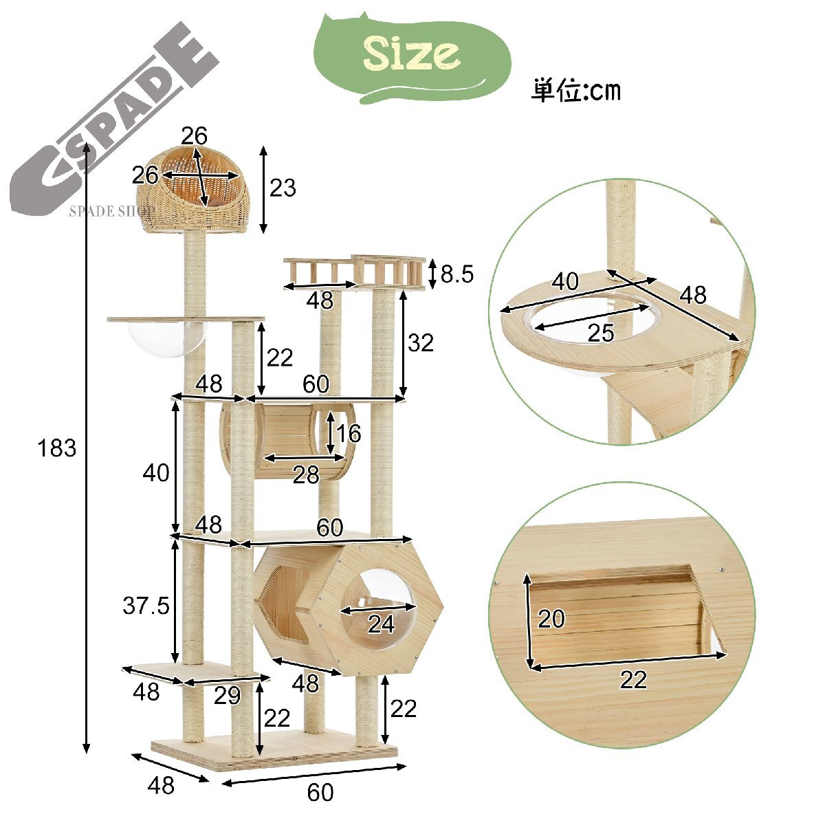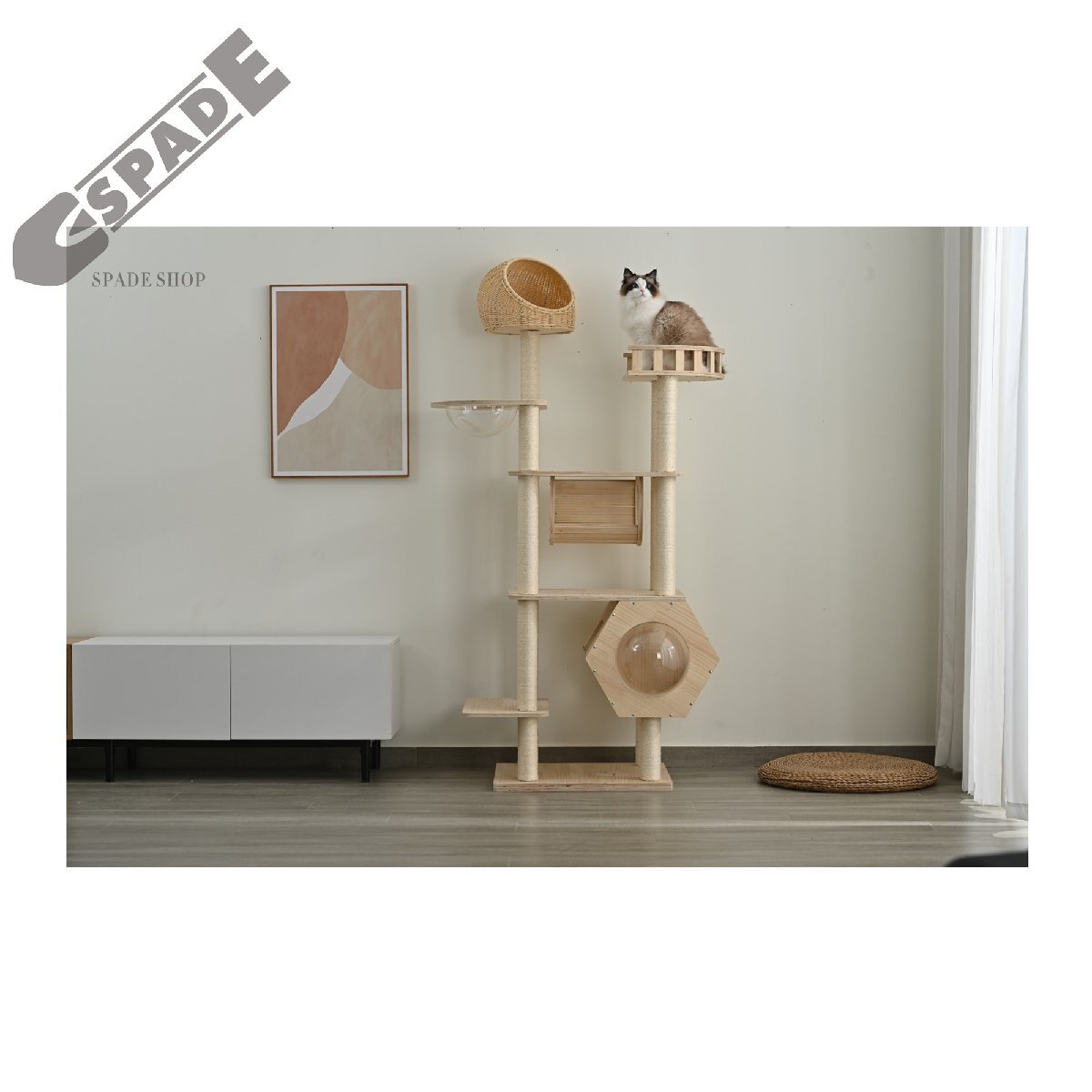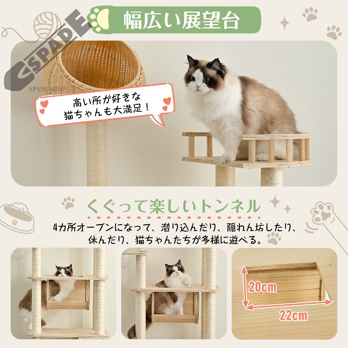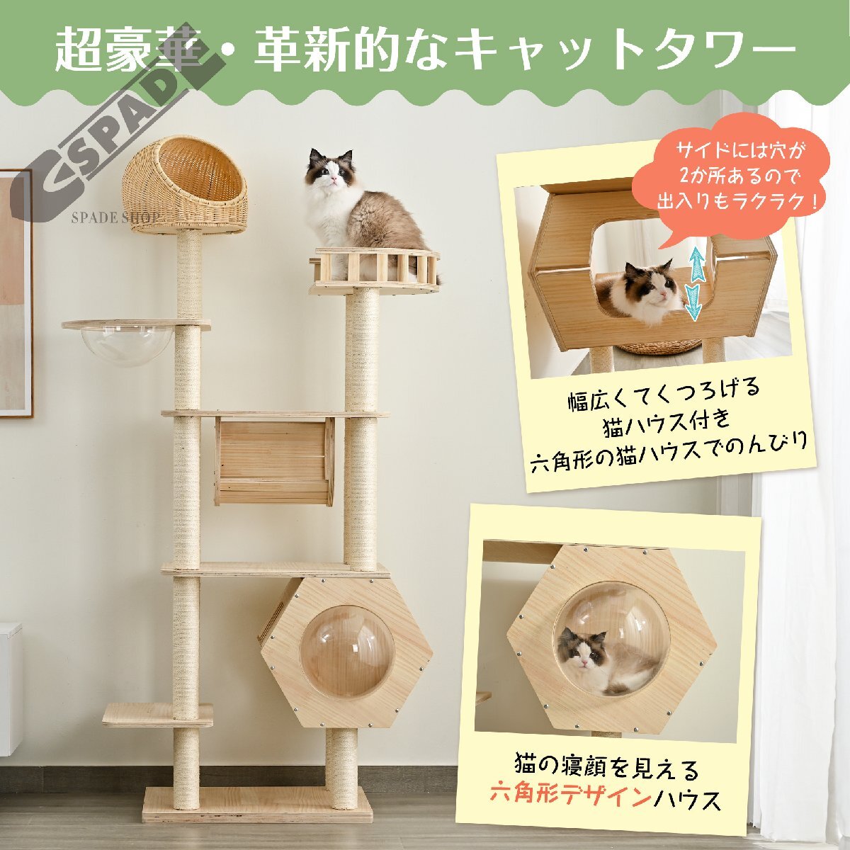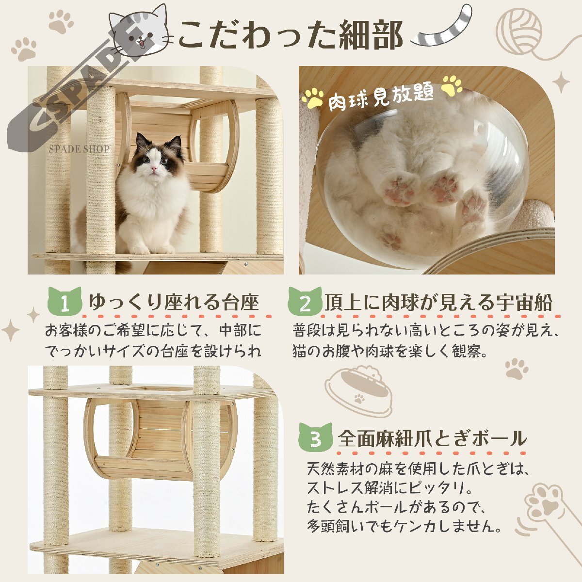 • 【ネコちゃんが喜ぶ機能満載】15ヶ所以上の爪とぎポール、幅広い台座、登りやすいジャンプ台、見晴らしのよい展望台、遊び放題の台座、トンネル、六角形デザインハウス、宇宙船などを用意しました。