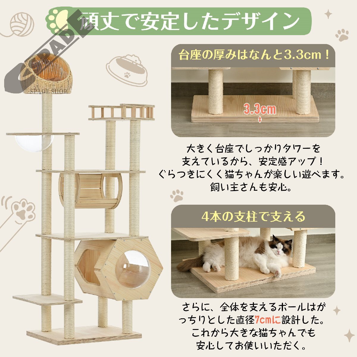 • 【抜群の安定感加厚した幅広い】キャットタワーの土台となる部分だからこそ、底板の厚みをしっかり持たせました。厚くすることで土台に重みが付き、重心が下がるため抜群の安定感が生まれます。
