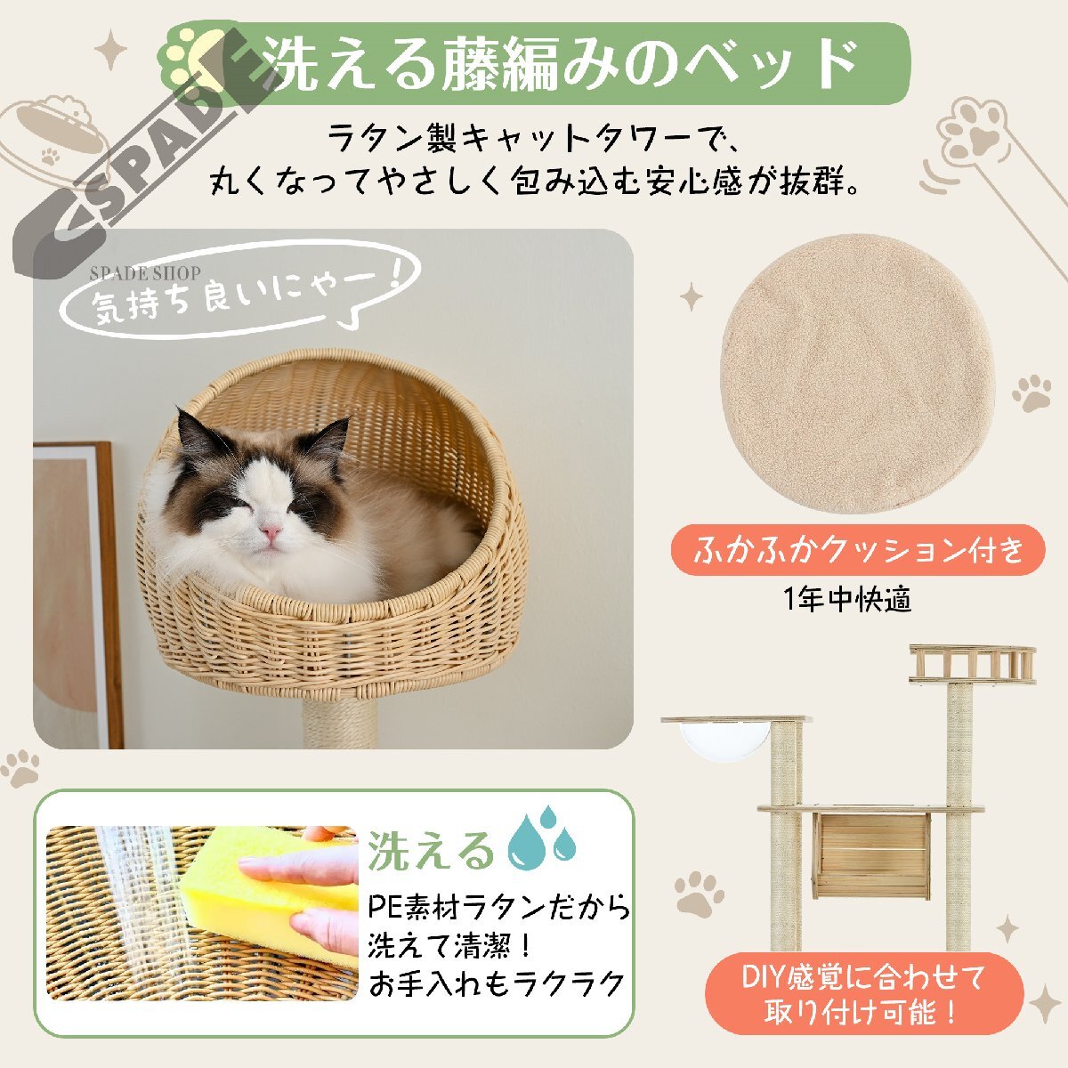 • 【洗える藤編みのベッド】頂上には洗える藤編みのベッドがあります。天然素材で作られて、丈夫で軽い!汚れても、PE素材ラタンだから洗えて清潔、清潔に保てるのでお手入れが楽々です。