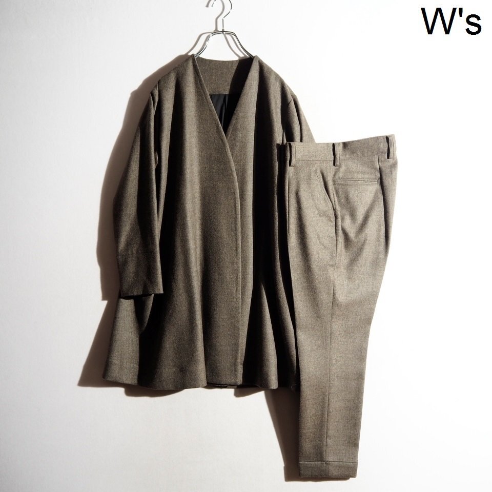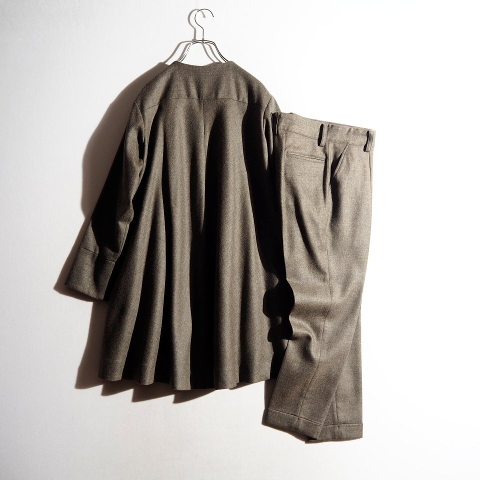 ウールサキソニー ノーカラーロングジャケット テーパードパンツ セットアップ カーキグレー 1