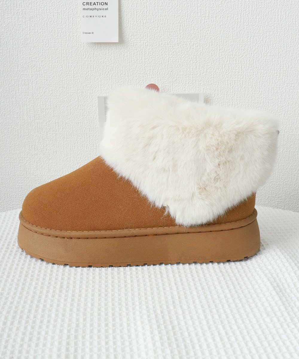 履き口にボリュームたっぷりのフェイクファーをあしらったデザインのムートンブーツ。