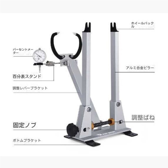 調整機能: 精度の高いダイヤルゲージが装備されており、微調整が簡単に行えます。ホイールの振れを正確に測定し、調整することが可能です。