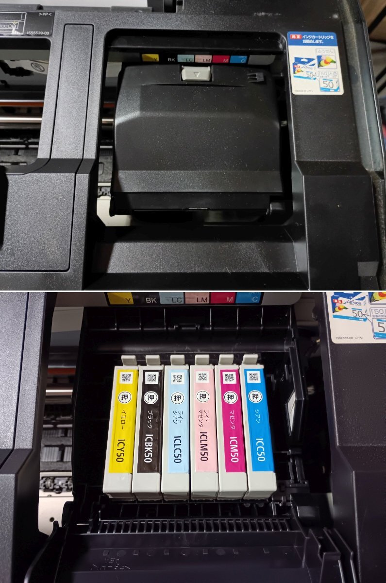 通電起動のみ確認済み、電源ランプ点灯を確認しました。 内部の状態、印刷動作、インク噴射、給紙、スキャン、ネットワークなどの詳細な動作は未確認です。