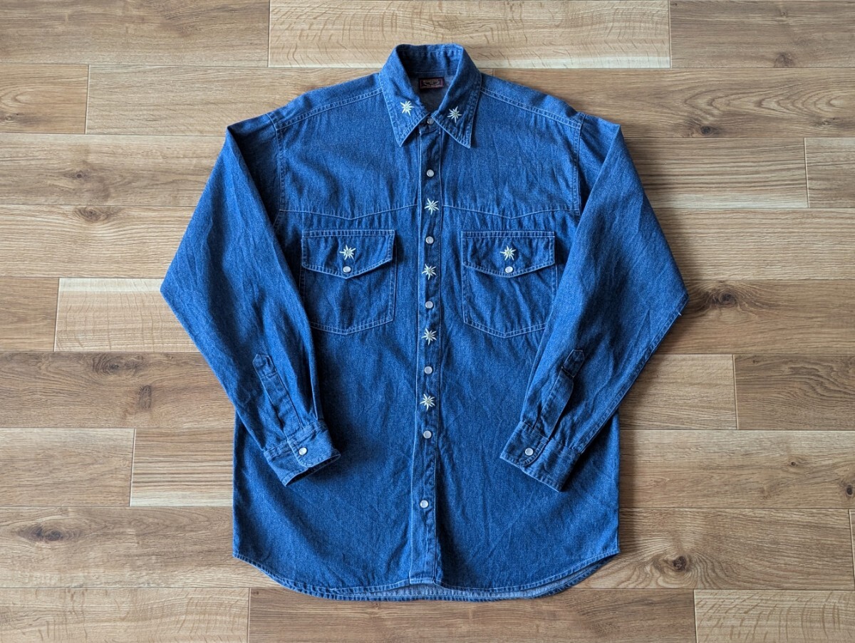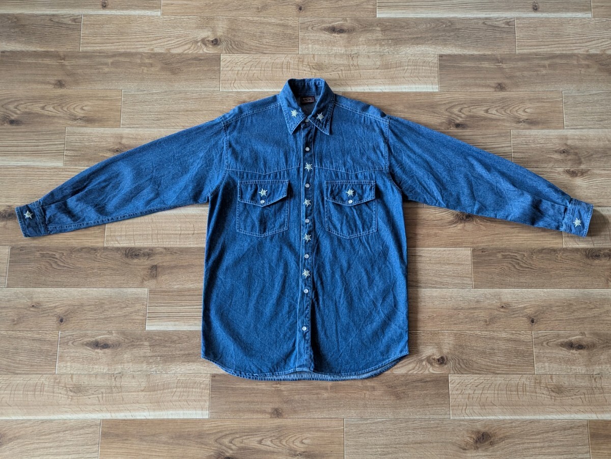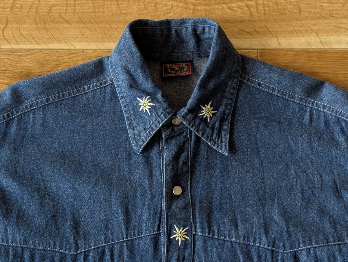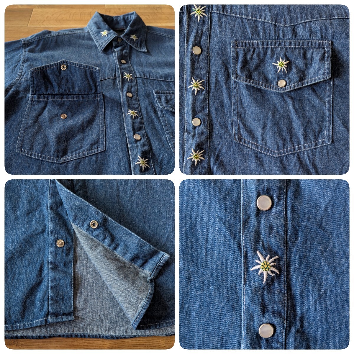 90's ヴィンテージ RONWEIL SWISS STYLED ウエスタンシャツ デニム ダンガリー エーデルワイス 刺繍 XS表記 Lサイズくらい ユーロ? 古着