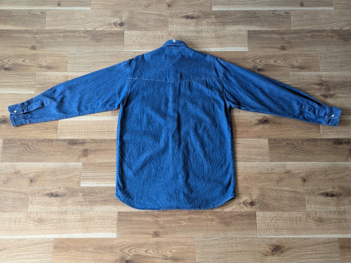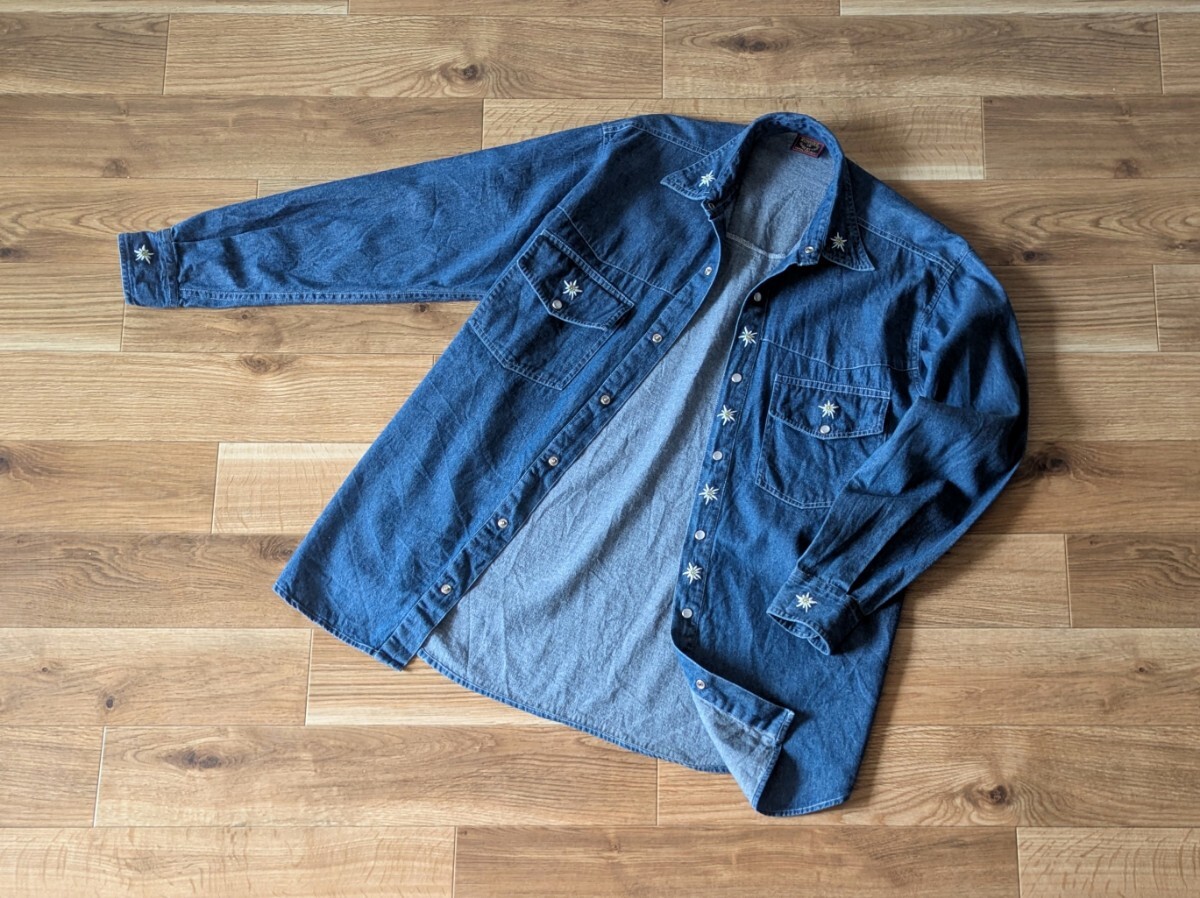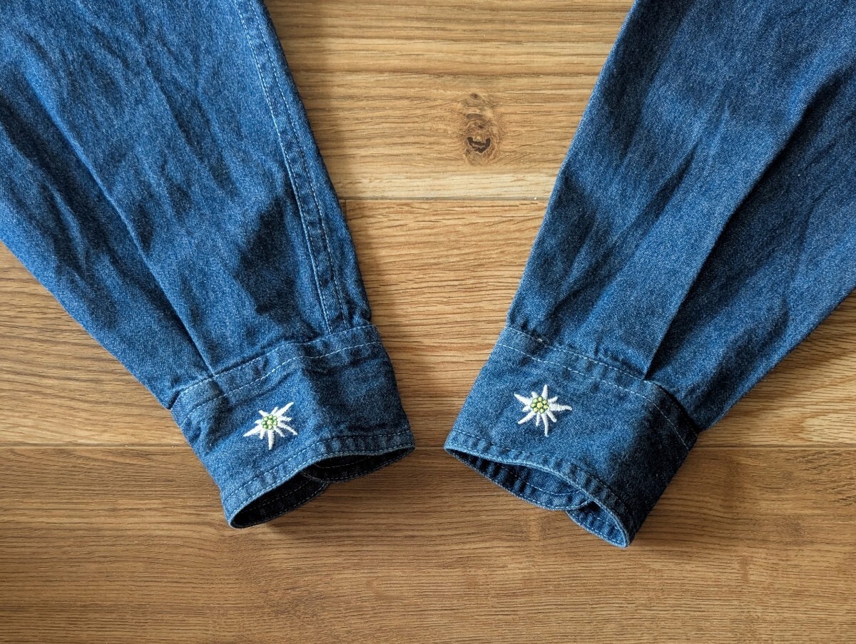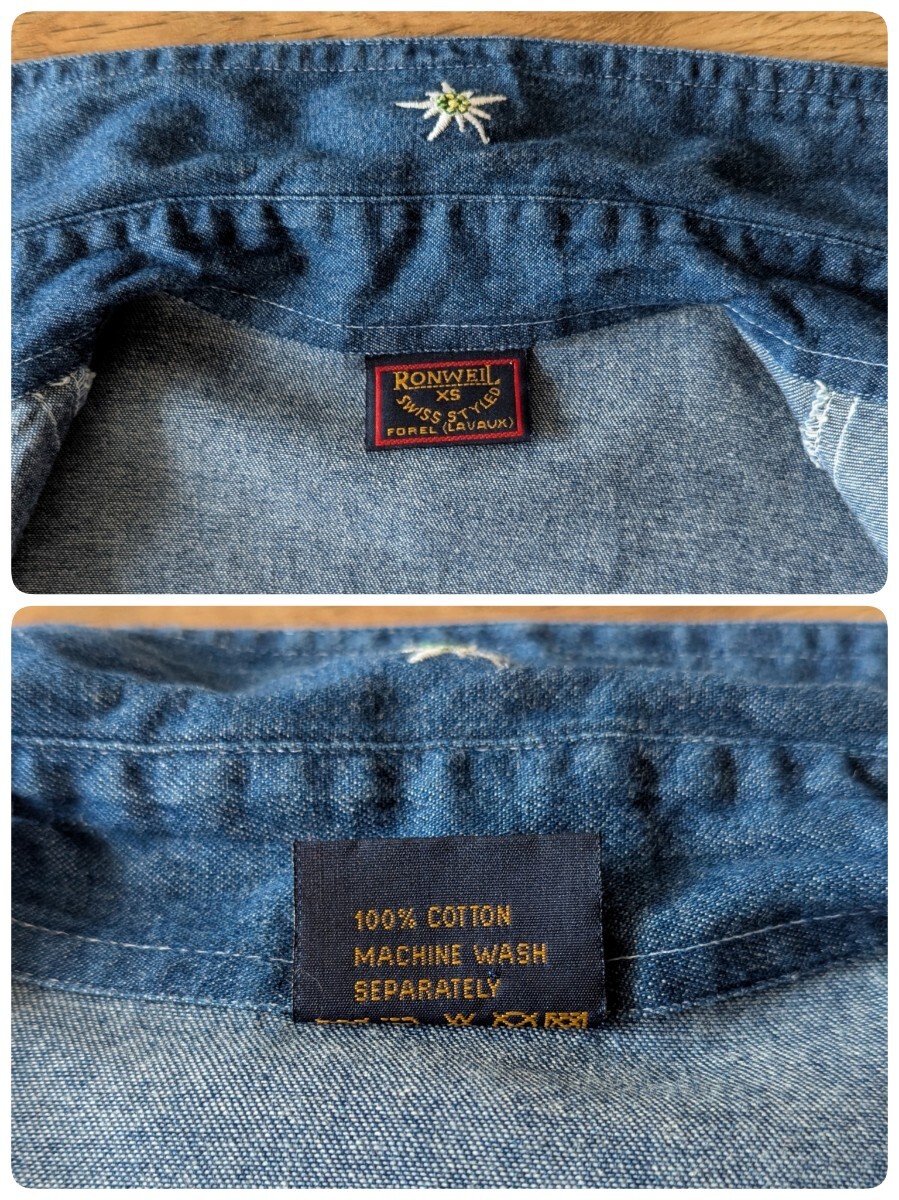 90's ヴィンテージ RONWEIL SWISS STYLED ウエスタンシャツ デニム ダンガリー エーデルワイス 刺繍 XS表記 Lサイズくらい ユーロ? 古着